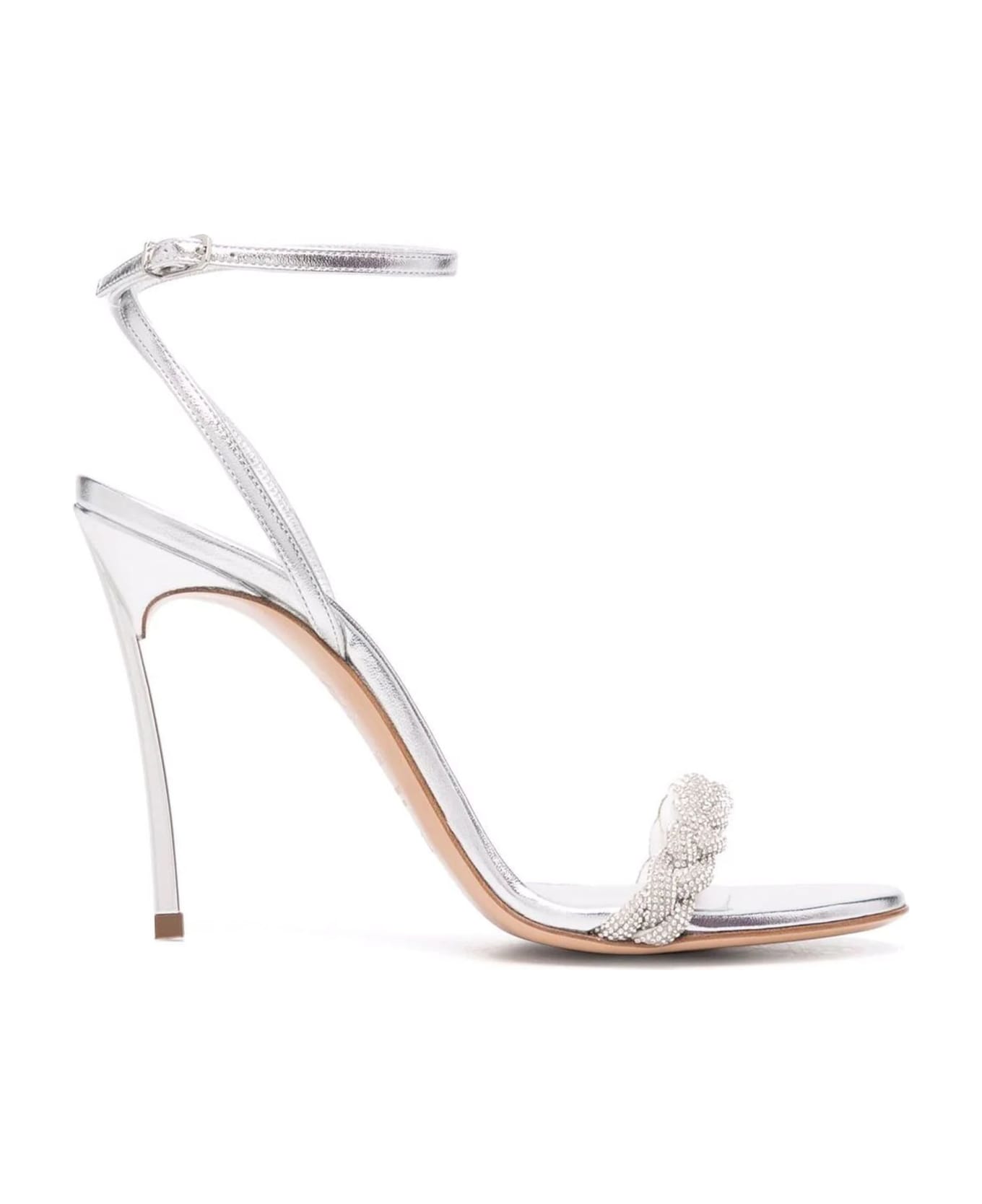 Silver leather Venezia sandals featuring metallic finish, braided strap, open toe, buckle-fastening ankle strap, branded heel counter, high stiletto heel Composition: Leather, 100%