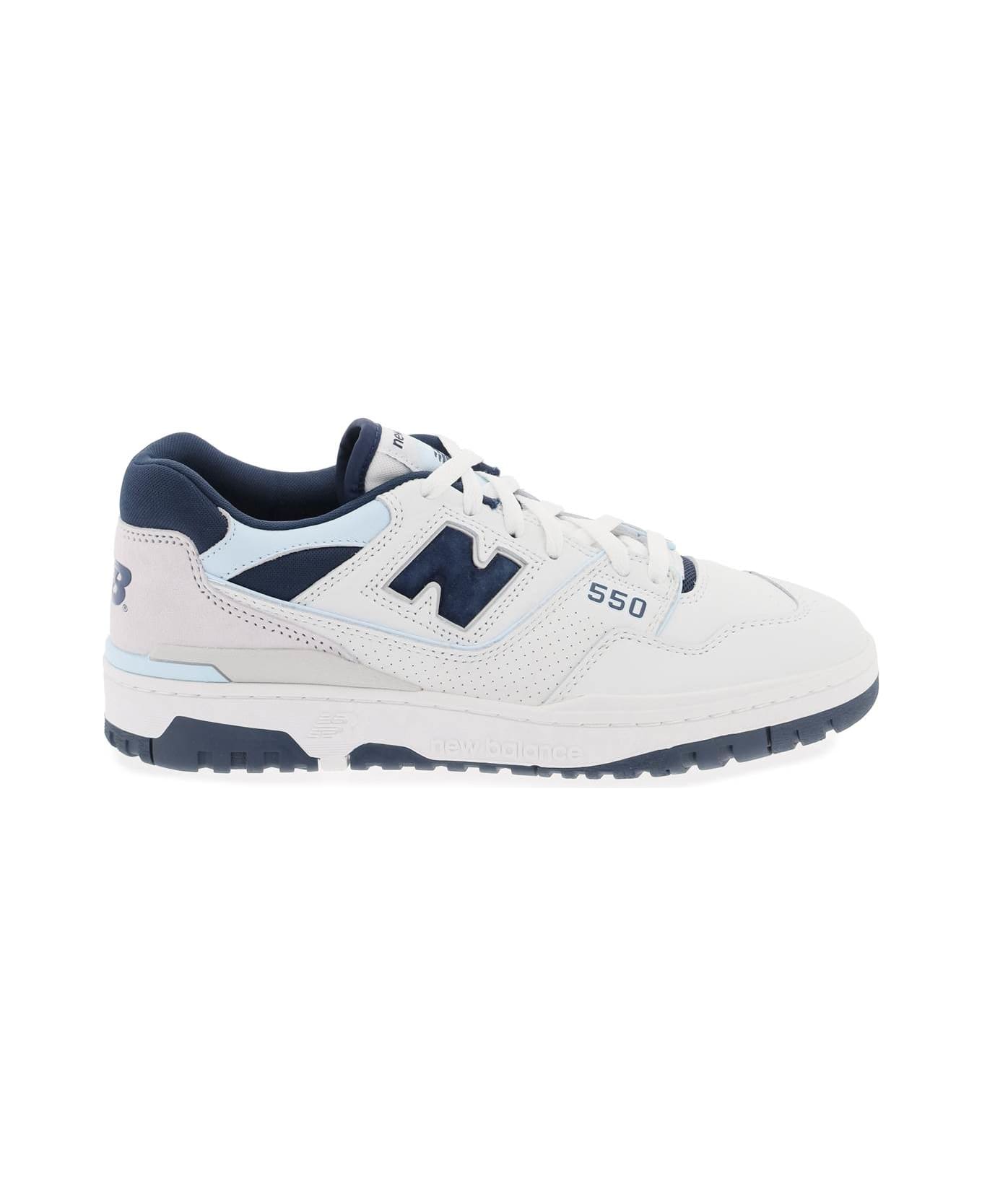 The New Balance 550 leather sneakers feature side perforations, an iconic "N" in suede on the sides, an "NB" logo imprinted on the suede insert at the back, and a "550" print on the side. The padded tongue is made of technical fabric with a fabric logo patch, while the spoiler is also made of technical fabric. The interior is lined with fabric and has a removable insole, and the rubber sole features a raised lateral logo and contrasting bottom.