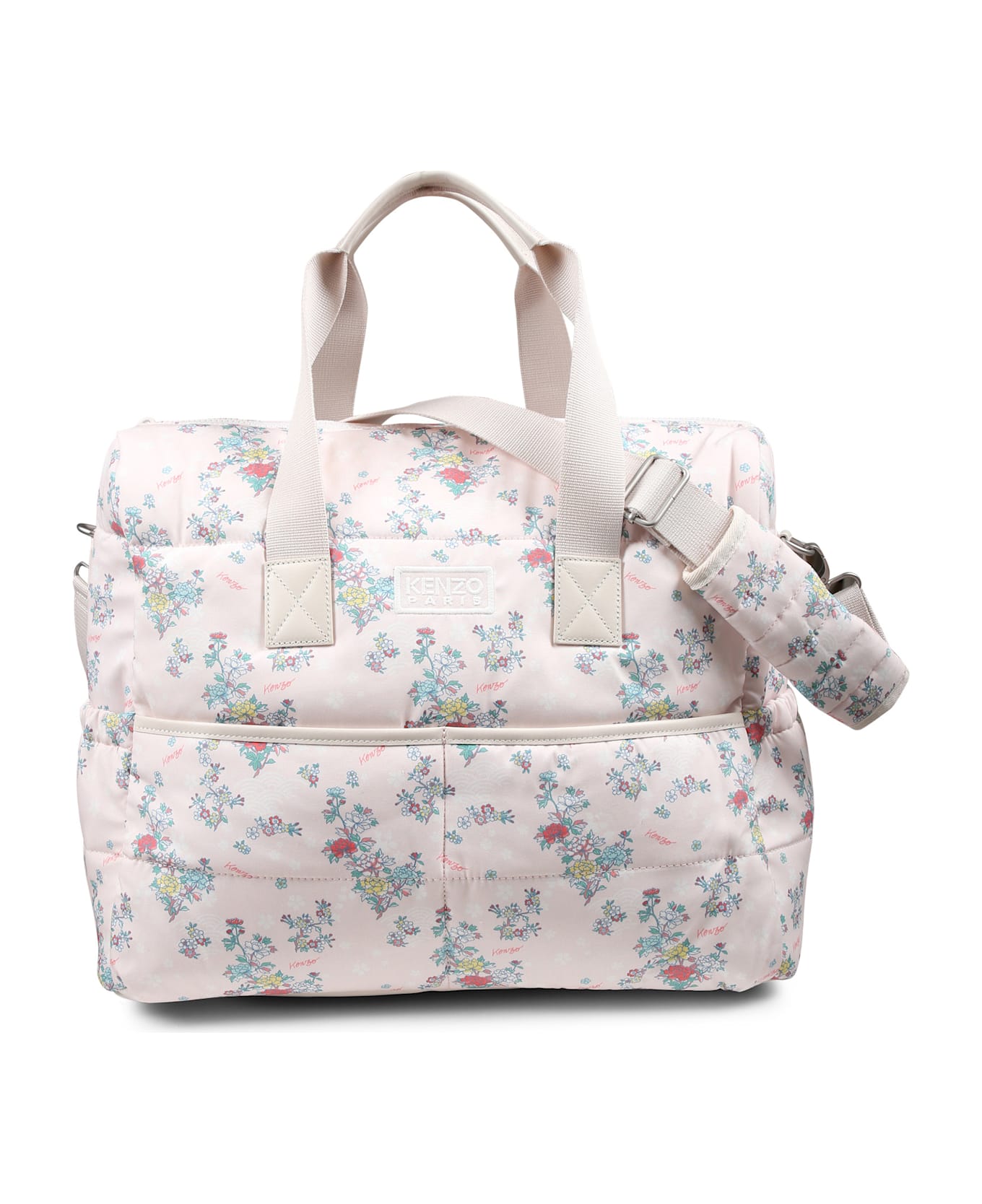 Pink changing bag from the French brand Kenzo Kids, in cotton poplin, with top zip closure, two front pockets, side pockets, handles, adjustable shoulder strap and integrated changing mat. It is embellished with embroidered logo on the front and all-over floral print