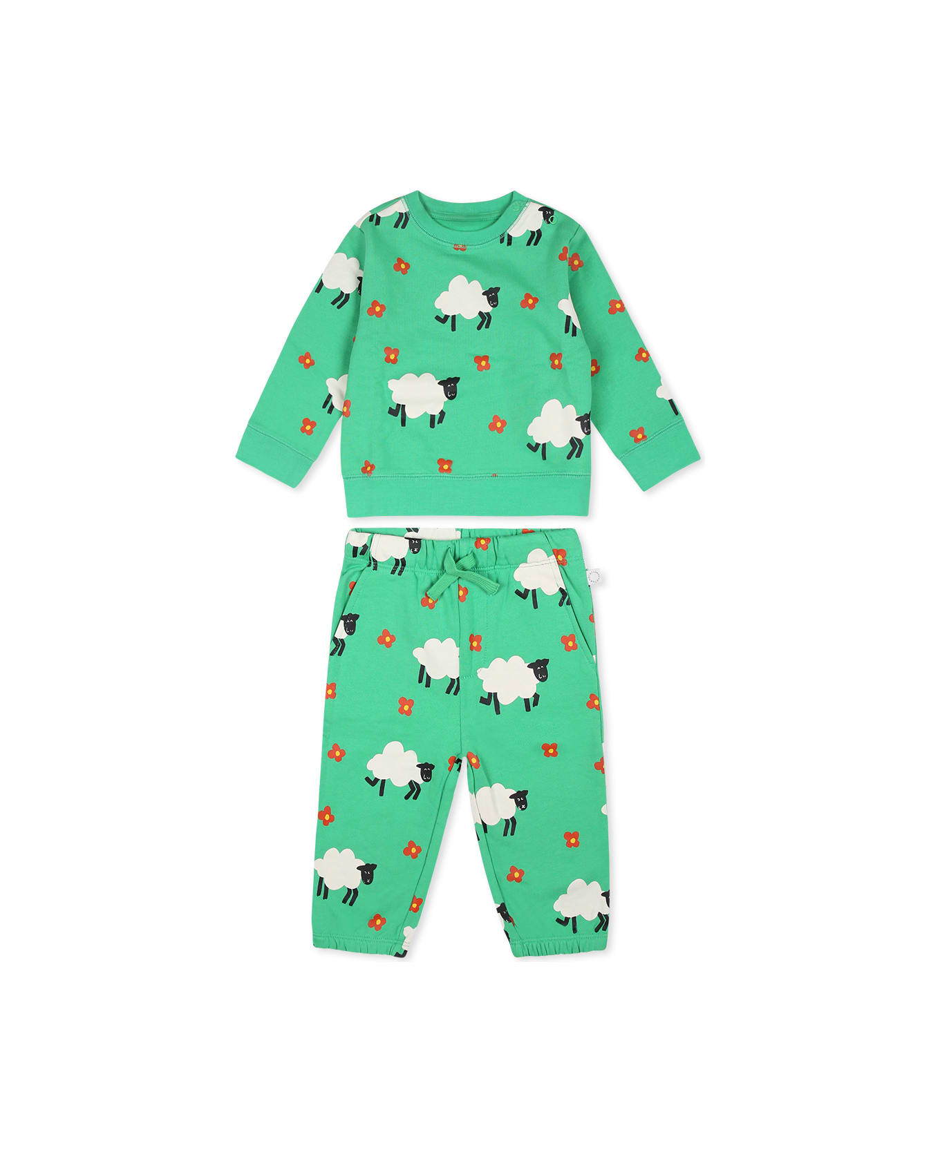 Green organic cotton sweatshirt and trousers set. Long-sleeved sweatshirt with ribbed crew neck, snap button fastening on the shoulder, ribbed cuffs and hem. Trousers with elasticated waist, drawstring, side pockets and elasticated ankles. It is embellished with all-over sheep and flower print.