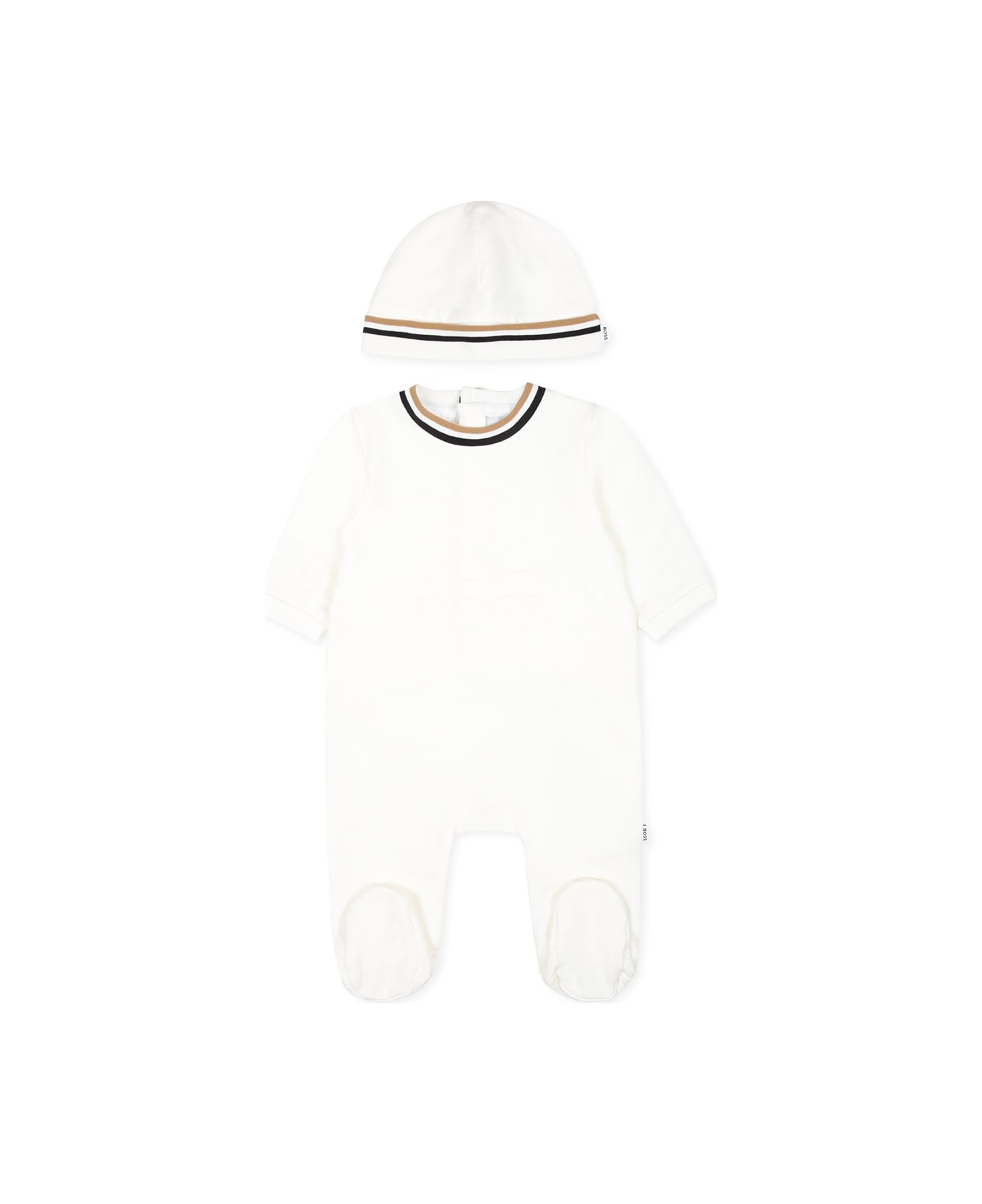 White set composed of romper and hat. White cotton fleece babygrow with long sleeves, ribbed crew neck and cuffs, button closure on the back and feet. It is embellished with logo on the front. White hat with ribbed hem, embellished with beige and black bands and side logo patch.