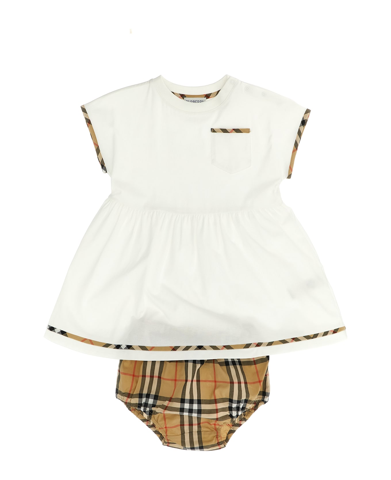 KIDS 'Lea' suit consisting of cotton jersey dress with Burberry Check details, crew neck, chest pocket, short sleeves, snap buttons on the left shoulder and woven cotton shorts with Burberry Check style, bloomer model, elastic waistband.