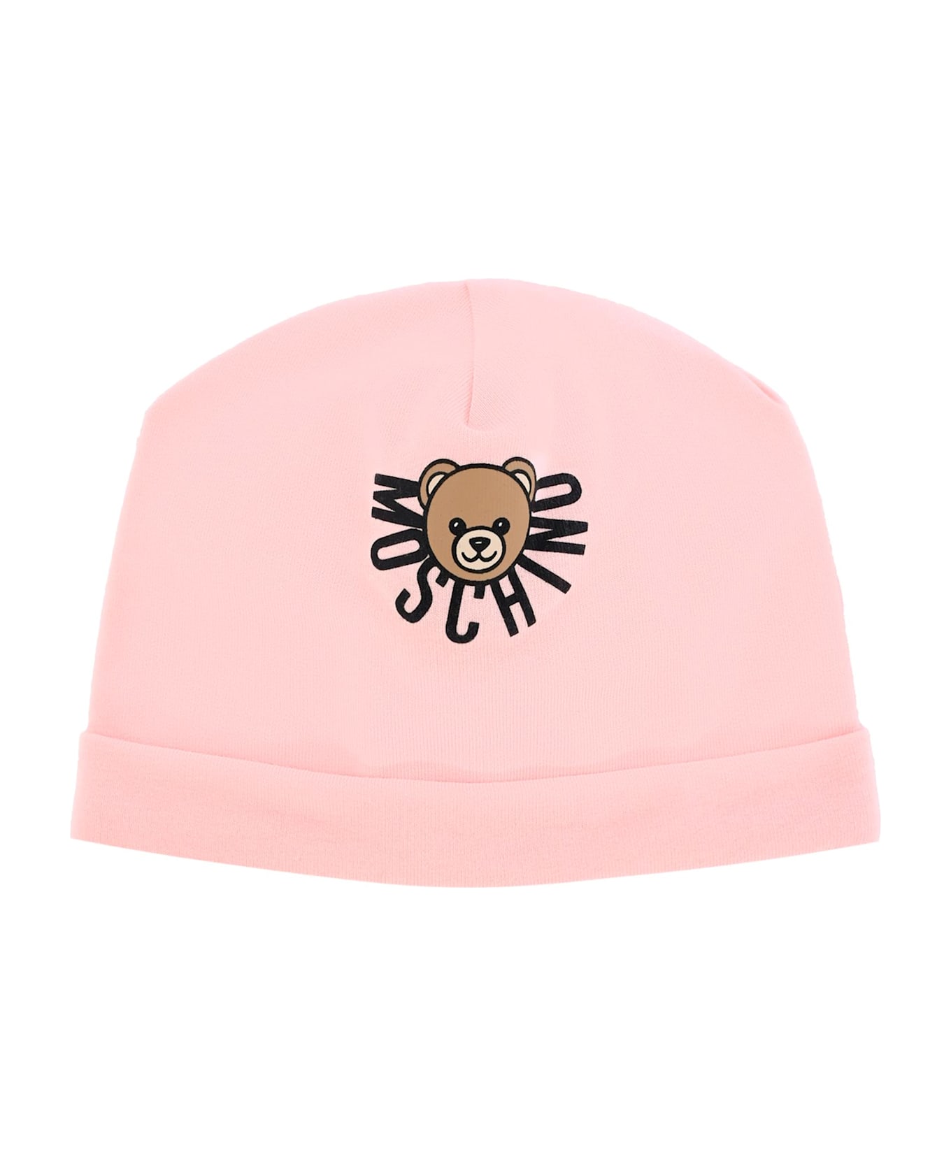 Pink hat from the Moschino Kids brand, made of mixed cotton, with cuff; it is embellished with Teddy Bear and circular logo.