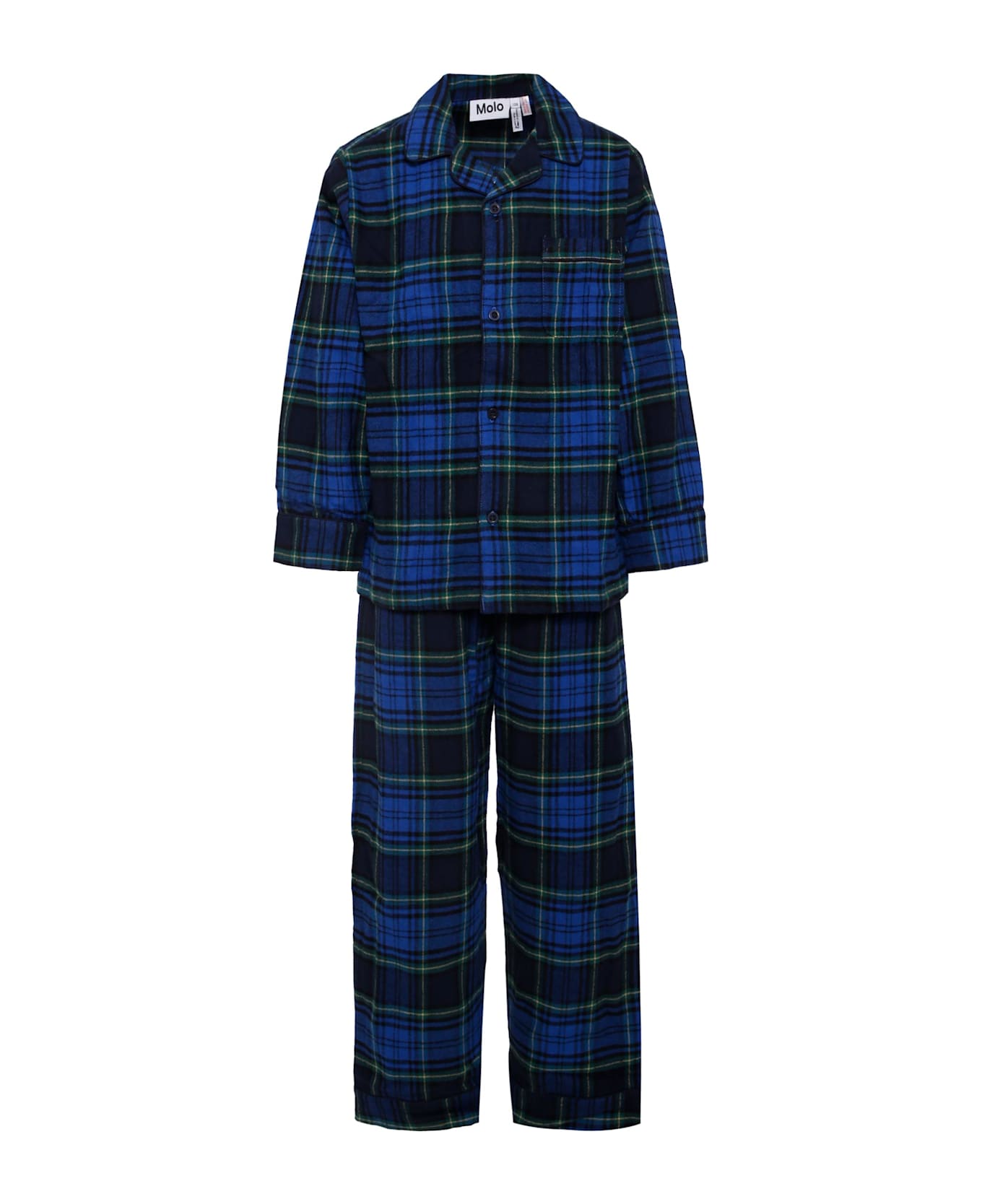 Blue tartan pyjamas in warm cotton, consisting of a shirt and trousers; it is made of GOTS certified organic cotton. Long-sleeved shirt, with lapel collar, front button fastening and chest pocket; trousers with elasticated waist and drawstring.
