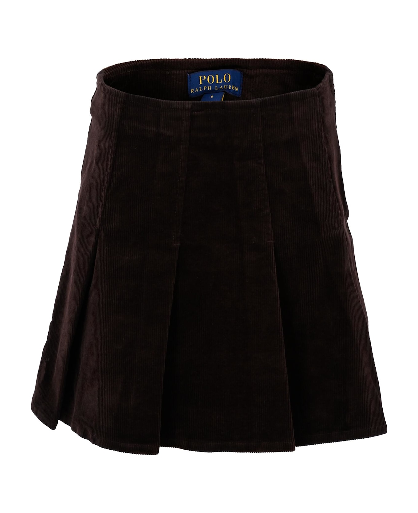 Brown pleated skirt in corduroy, with side zip fastening and adjustable waist thanks to internal elastic with buttons. It is embellished with an iconic brown embroidered horse on the front.