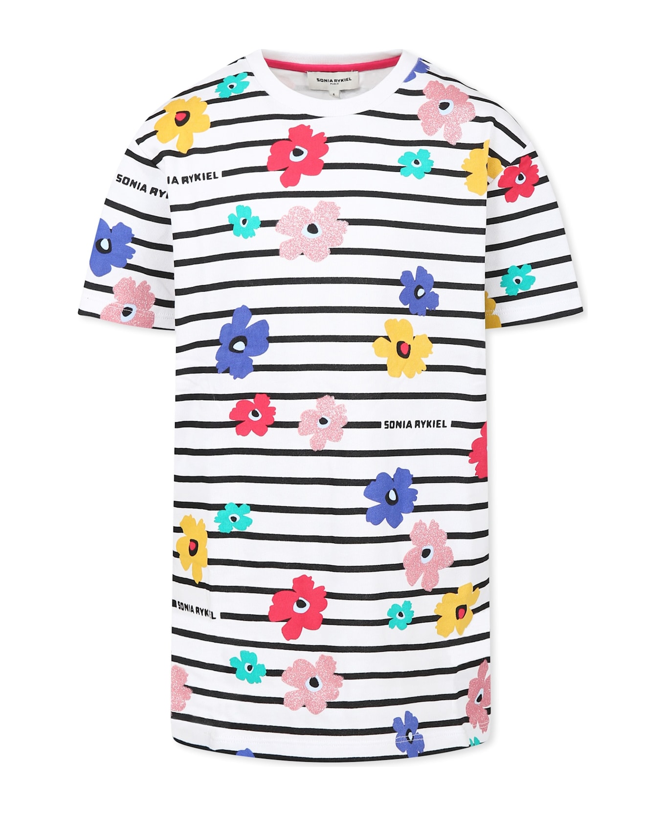 Black and white striped dress, with short sleeves, ribbed crew neck and side pockets. It is embellished with all-over flowers.
