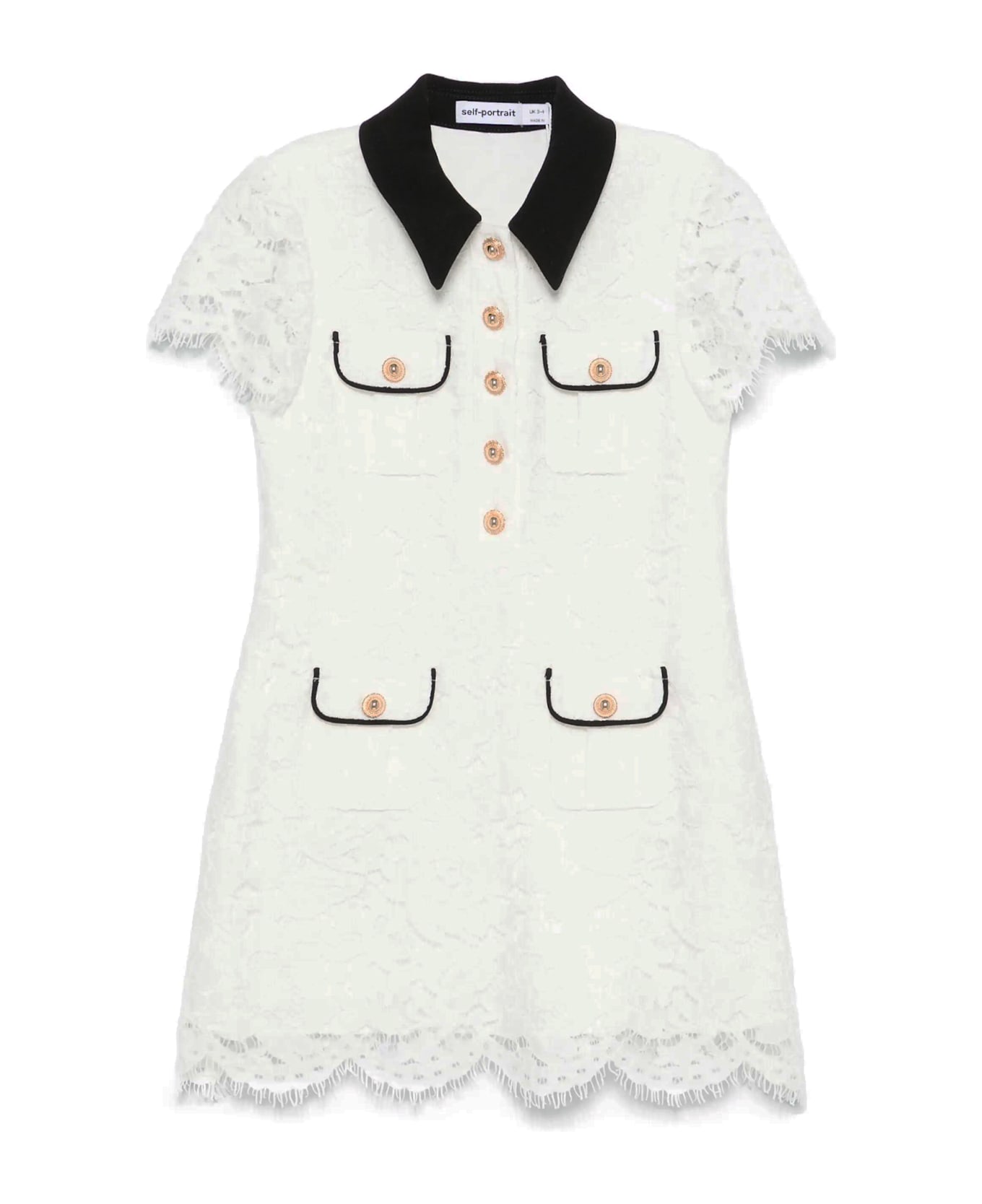 White lace dress, long sleeves, with black pointed collar, front fastening with gold buttons, flap pockets with button on the front and contrasting black piping.