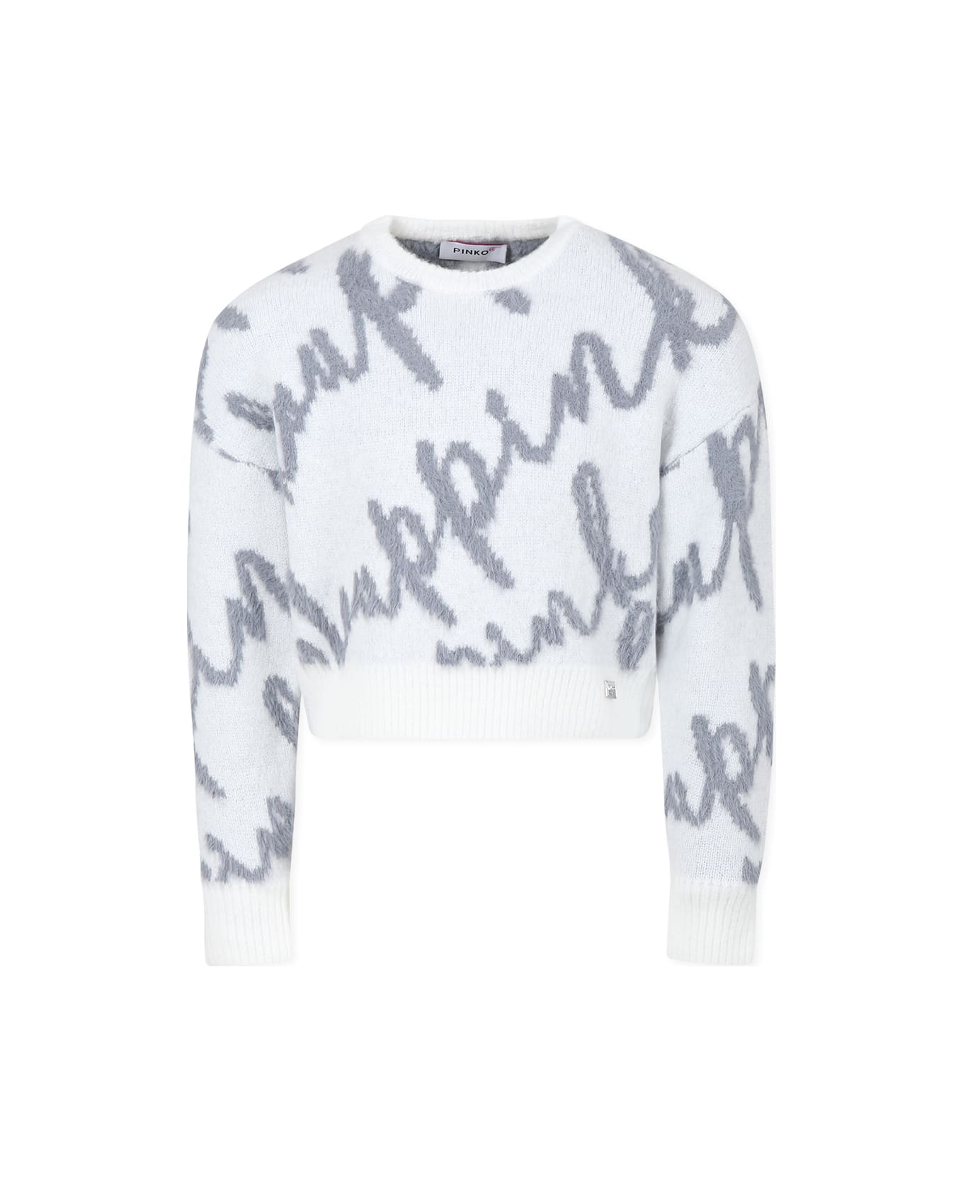 White long-sleeved crop sweater with ribbed crew neck, cuffs and hem. It is embellished with all-over contrasting jacquard logo and metal logo patch on the front.