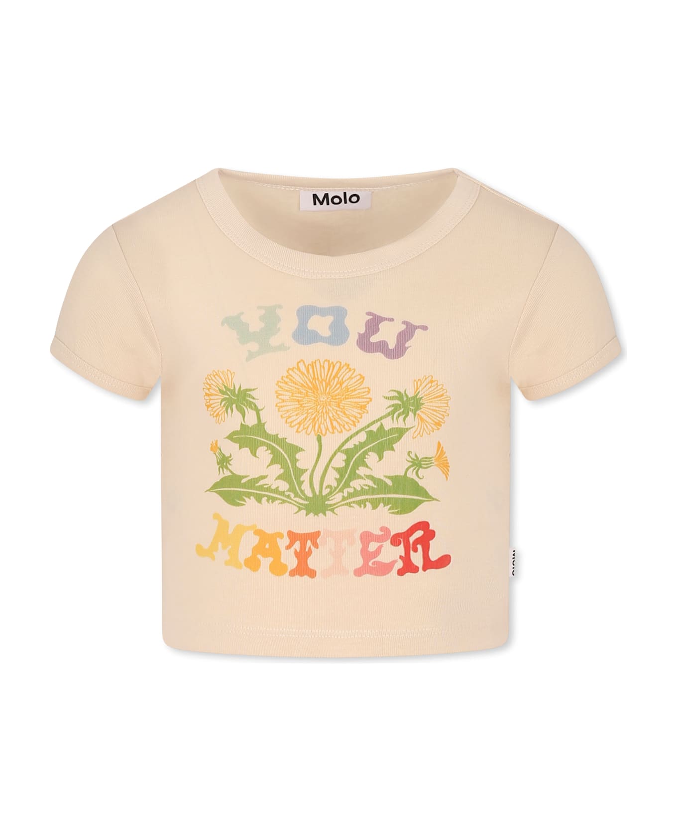 Ivory t-shirt in GOTS certified organic cotton, with short sleeves and a ribbed crew neck. It is embellished with flowers and writing, on the front.