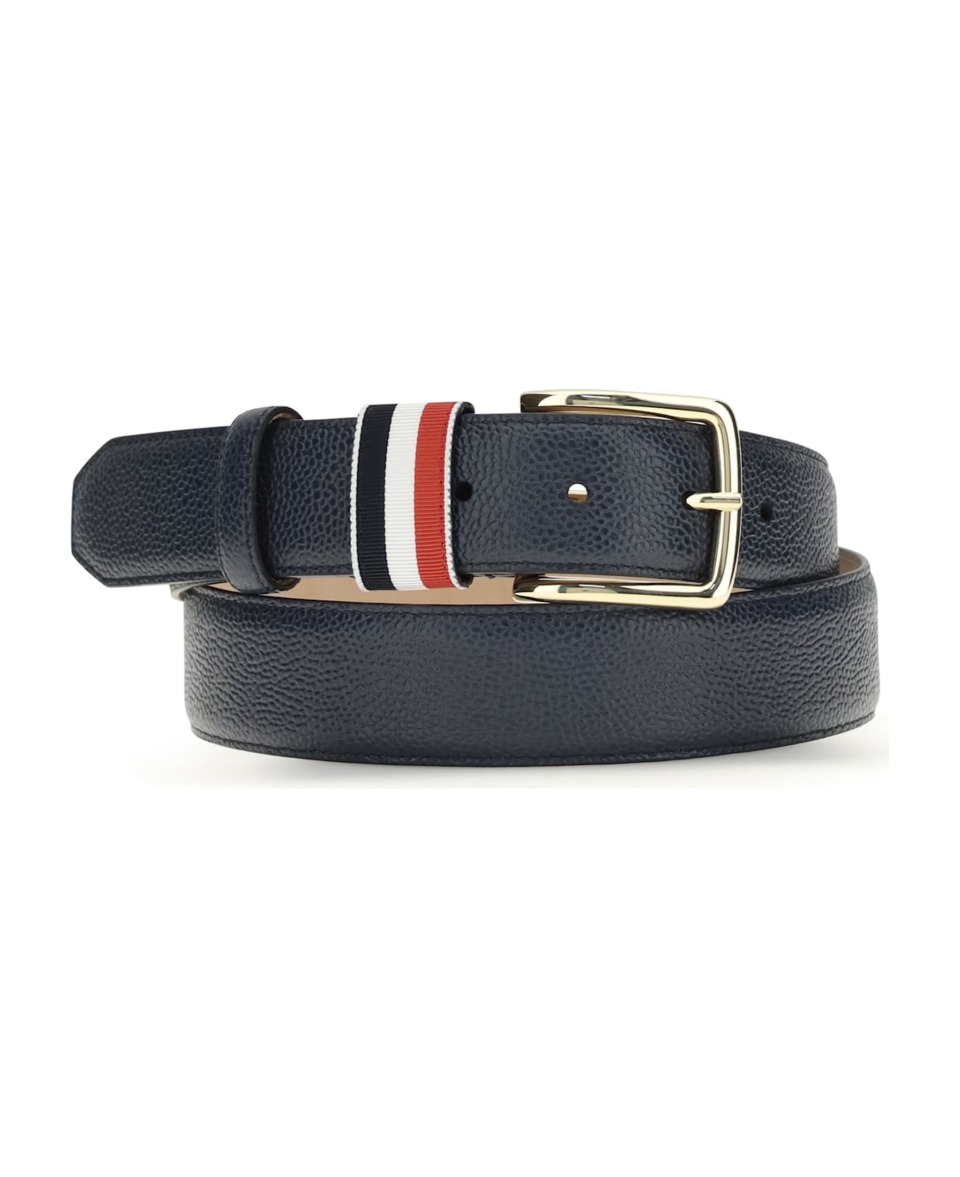 The hammered leather belt by thom browne combines craftsmanship and distinctive style. featuring a geometric buckle and classic detailing with the iconic tricolor bands, it lends a recognizable and refined touch to any look. width 3. 5 cm, ideal for versatile, everyday use.