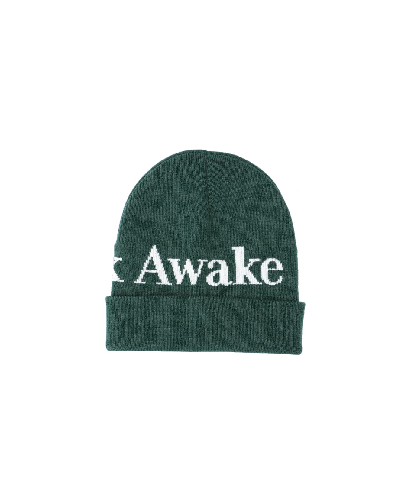 Awake NY "Serif" logo beanie in dark green fabric with contrasting logo intarsia on the front and back, blue logo label on the back, turn-up on the bottom.