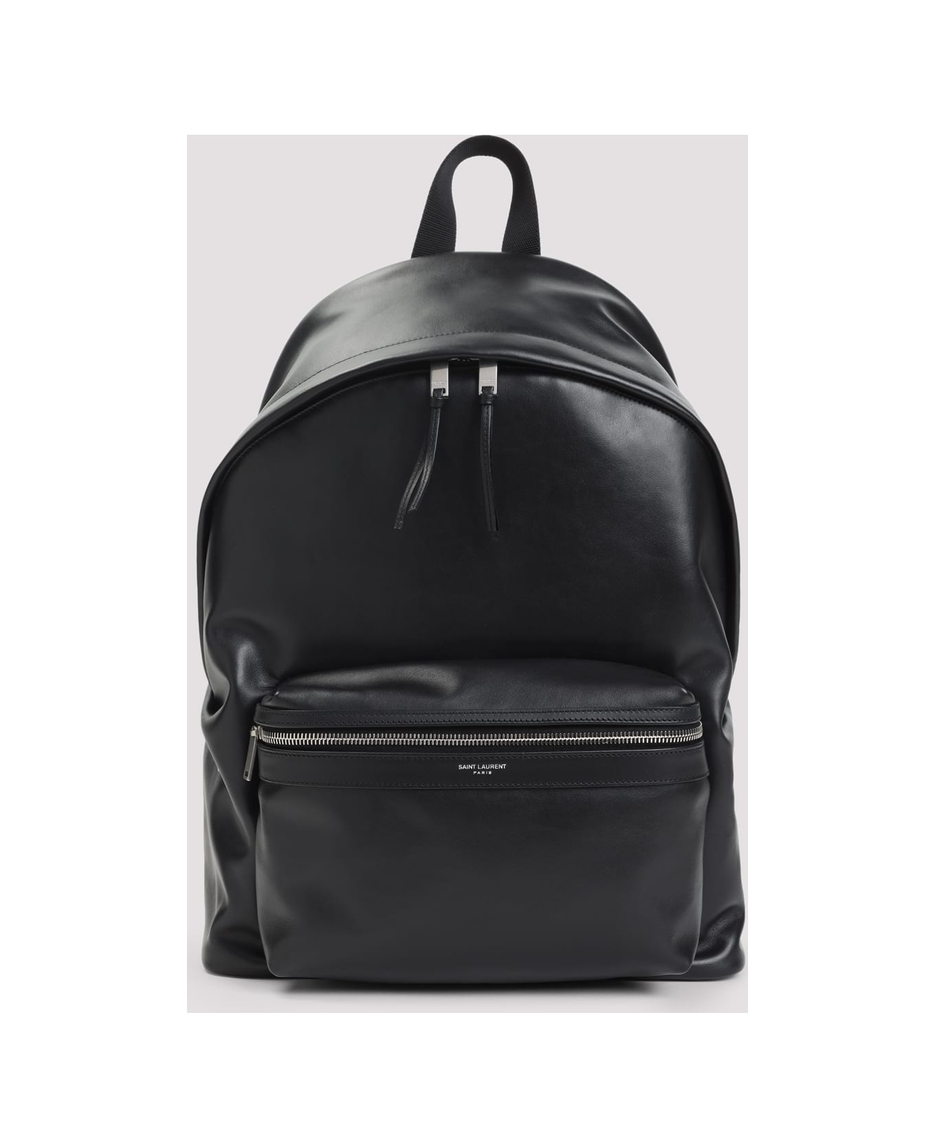 Saint Laurent City Black Leather Backpack. Crafted from black leather, silver-toned hardware, two-way zip fastening, leather pullers detail, top web handle, zip pocket with stamped logo on the front, back padded and adjustable shoulder straps.