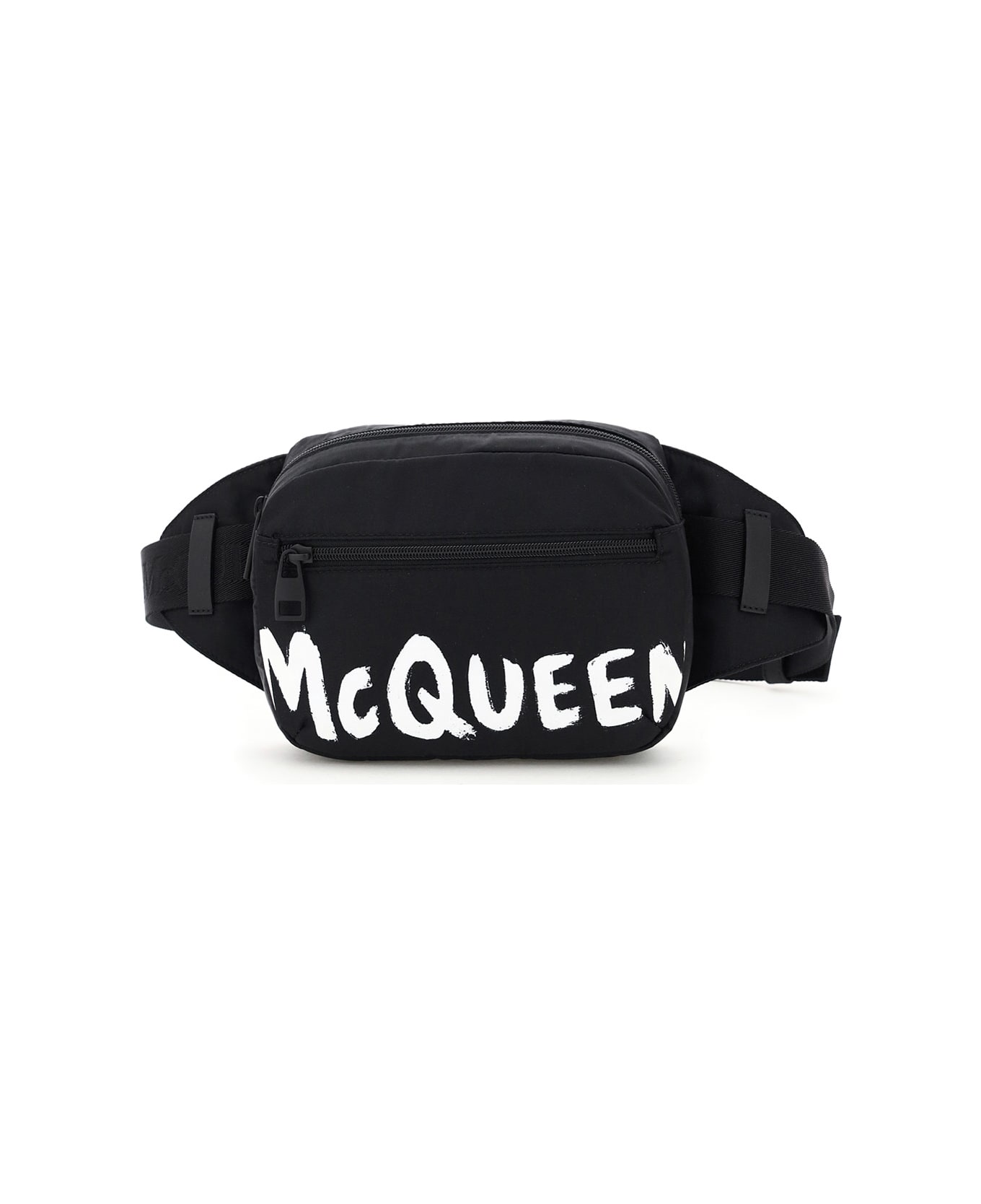 Alexander McQueen nylon canvas beltpack with leather details, featuring front "graffiti" logo print, zip closure, front zip pocket, adjustale webbing belt with jacquard logo and logoed clip buckle. Jacquard fabric lining, one inner leather pocket.