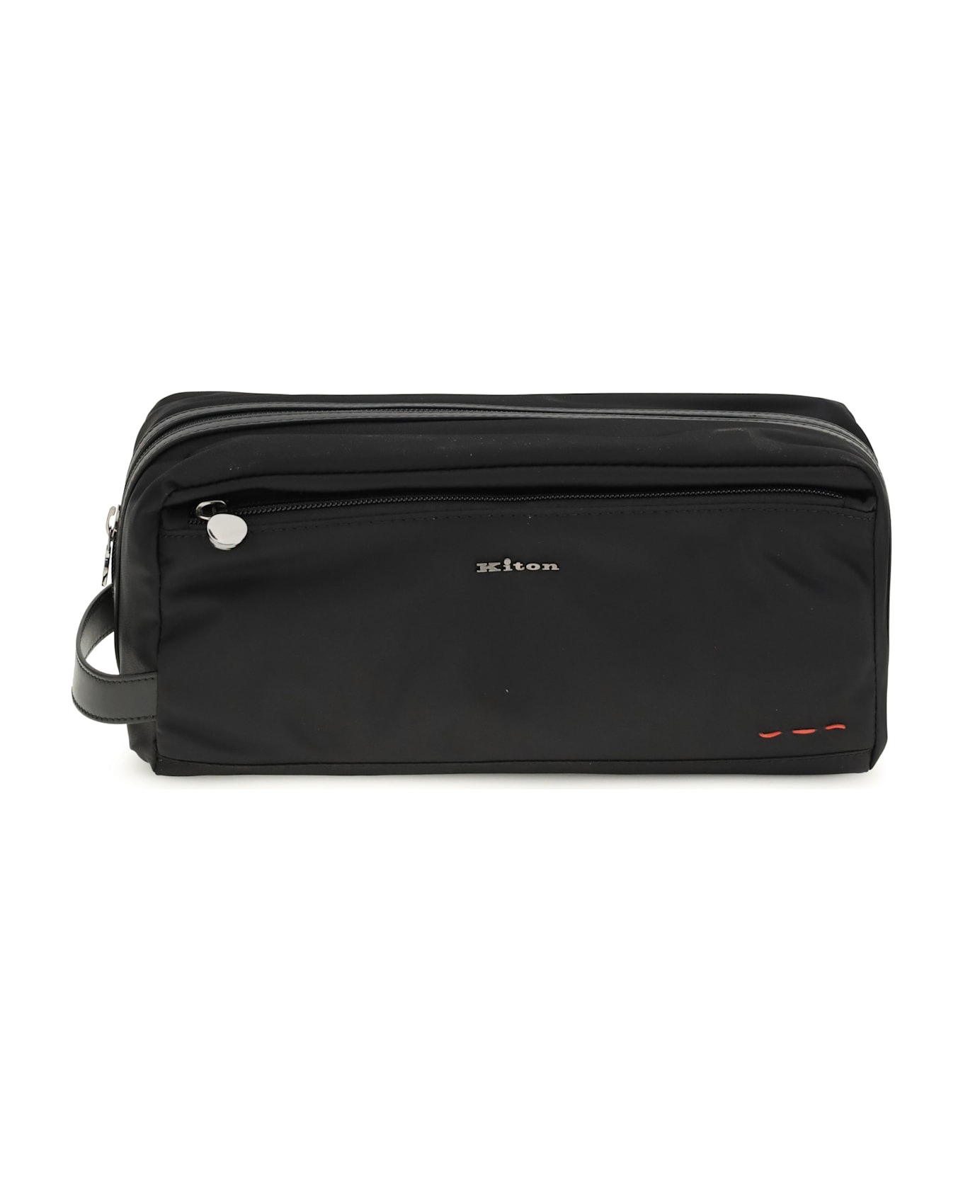 The beauty case by kiton combines elegance and functionality with a top zipper closure and front and back pockets that are always handy. the leather side handle provides practicality, while the brass logo on the front adds a refined and distinctive detail. Composition: 90% % Nylon, 10% % Acrylic