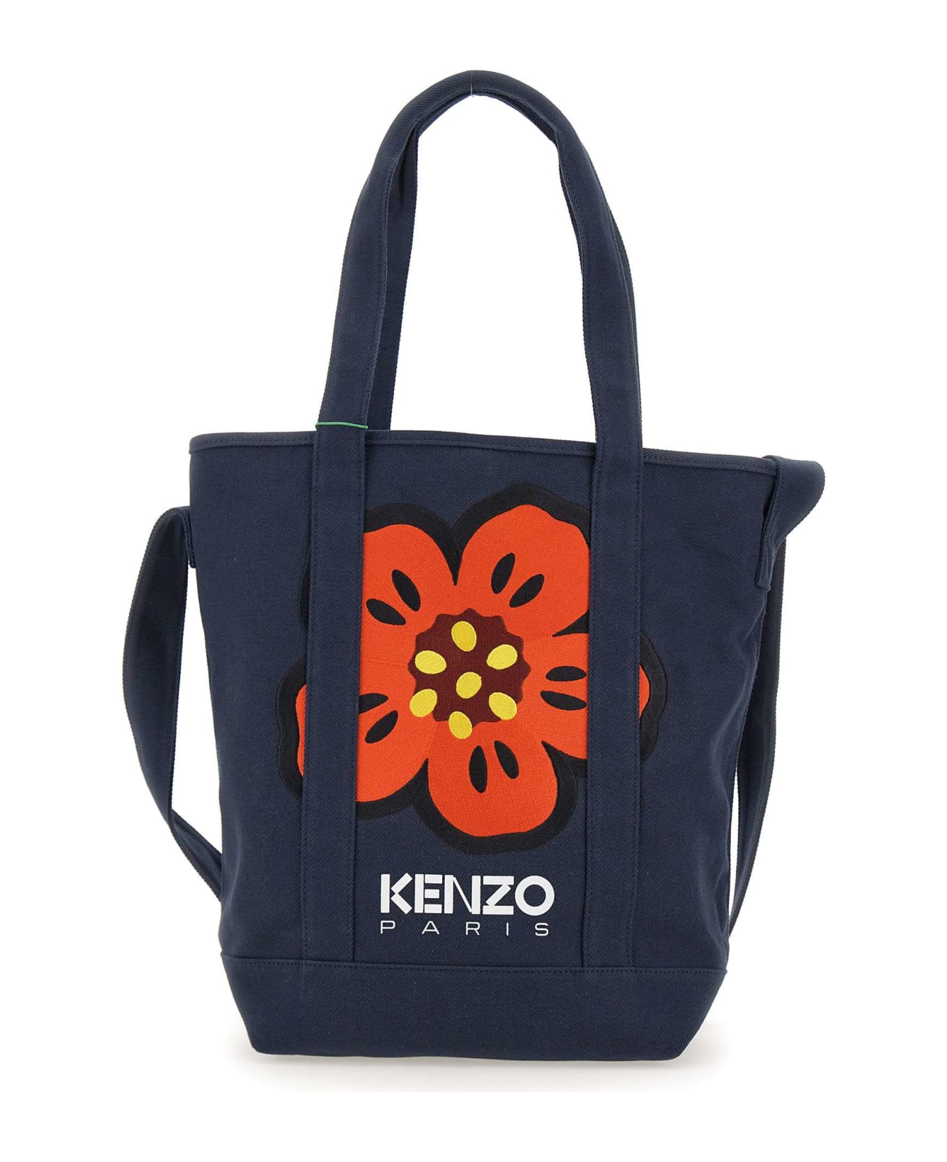 Kenzo Paris "Tote" shoulder bag, blue, vertical shopper, double top handle, additional handle for wearing over shoulder, hook closure, single compartment, inside pocket, multicolor Flower logo, logo patch on back. Measurements: length 39cm, height 37cm, depth 14cm. Made in Italy.