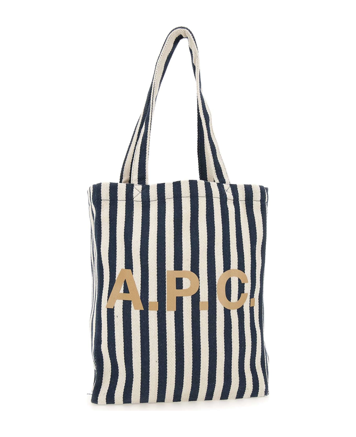 Shoulder bag men's A. P. C. "Tote Lou" fabric, double top handle, cream and blue vertical stripes pattern, inside pocket, beige logo print on front. Dimensions: length 28cm, height 35cm.