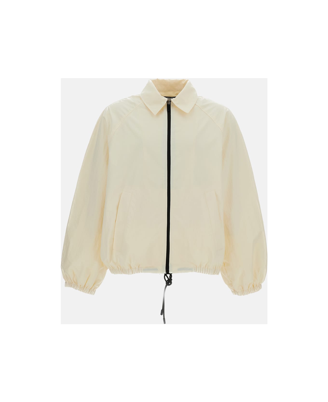 Textured technical fabric windbreaker Short cut Relaxed fit Embroidered logo on the back Pointed collar Contrast zip closure Elasticated cuffs and drawstring hem Lined Large front pockets Color: white Composition: 100% Polyester