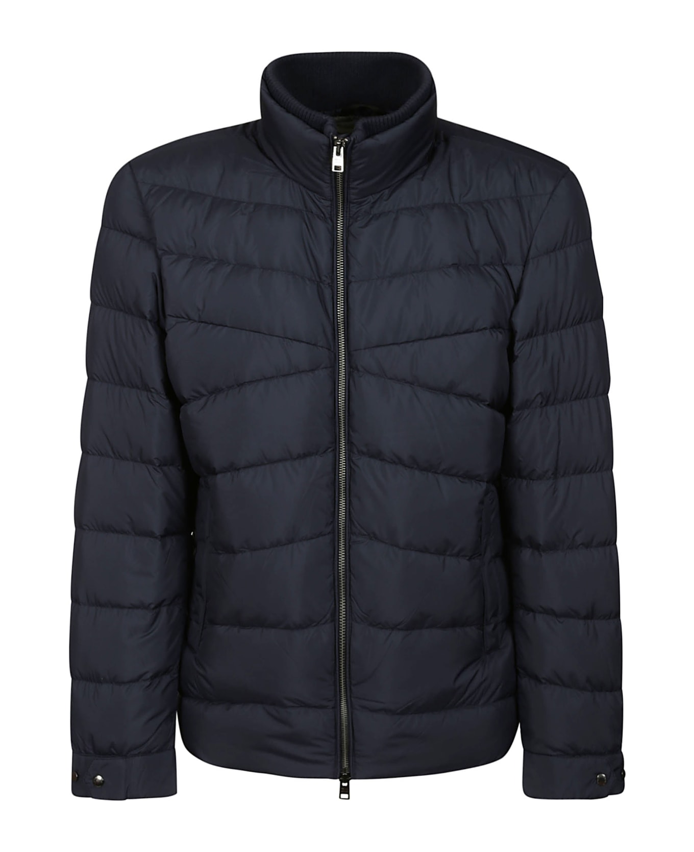 The WOOLRICH down jacket is a versatile and functional garment. Constructed from water-repellent and wind-resistant microfiber, it is padded with duck down to provide protection and warmth. It features a pure cotton jersey lining and Chevron quilting, with front and back squares in reverse direction for a unique touch. It has a high collar with ribbed internal details, a two-way zip closure, two flap pockets, and adjustable cuffs with snap buttons.