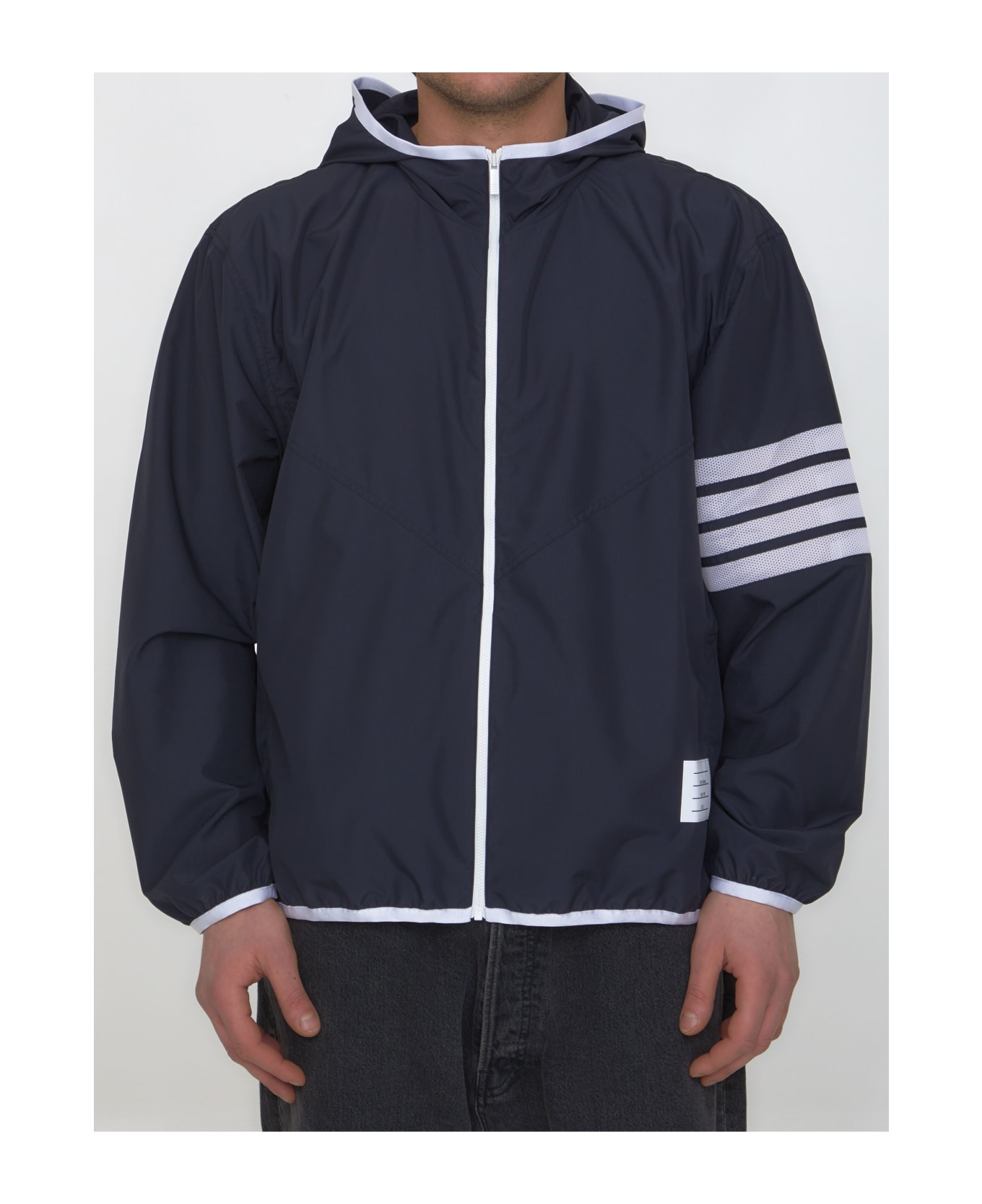 Packable jacket in blue ripstop with white 4-Bar detail on left sleeve. It features hood, front zip closure, two side welt pockets and Thom Browne tag on hem. Stretch cuffs and hem. The model is 190cm tall and wears size 03.