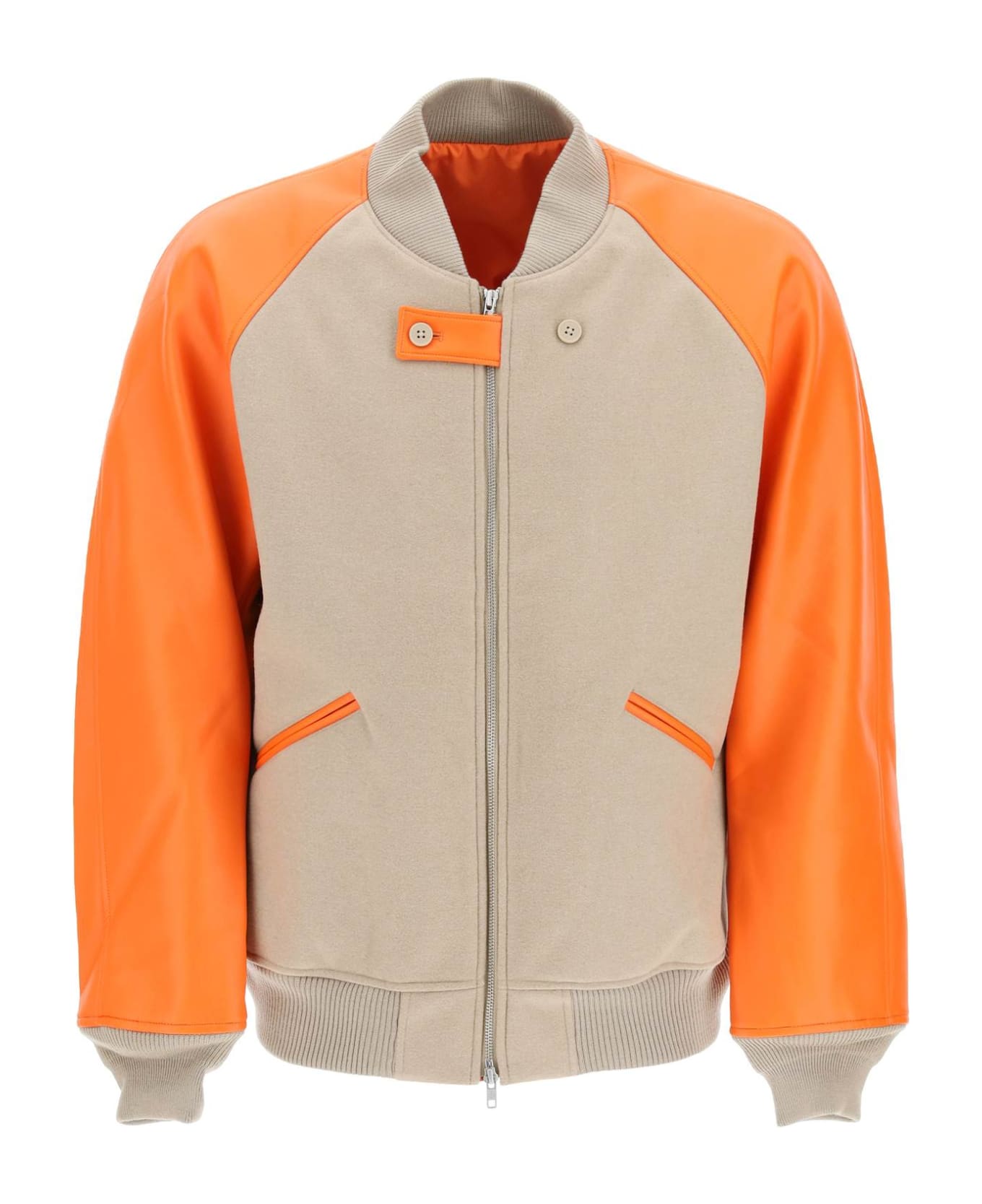 Y-3 varsity-inspired bomber jacket in wool blend with contrast faux leather raglan sleeves and details. Detailed with logo print on the upper back and rib-knit edges, it features a double-slider zip closure and a button tab, piped pockets and a contrast-lined interior with two pockets. Lightweight PrimaLoft recycled fiber padding. The model is 187 cm tall and wears a size L.