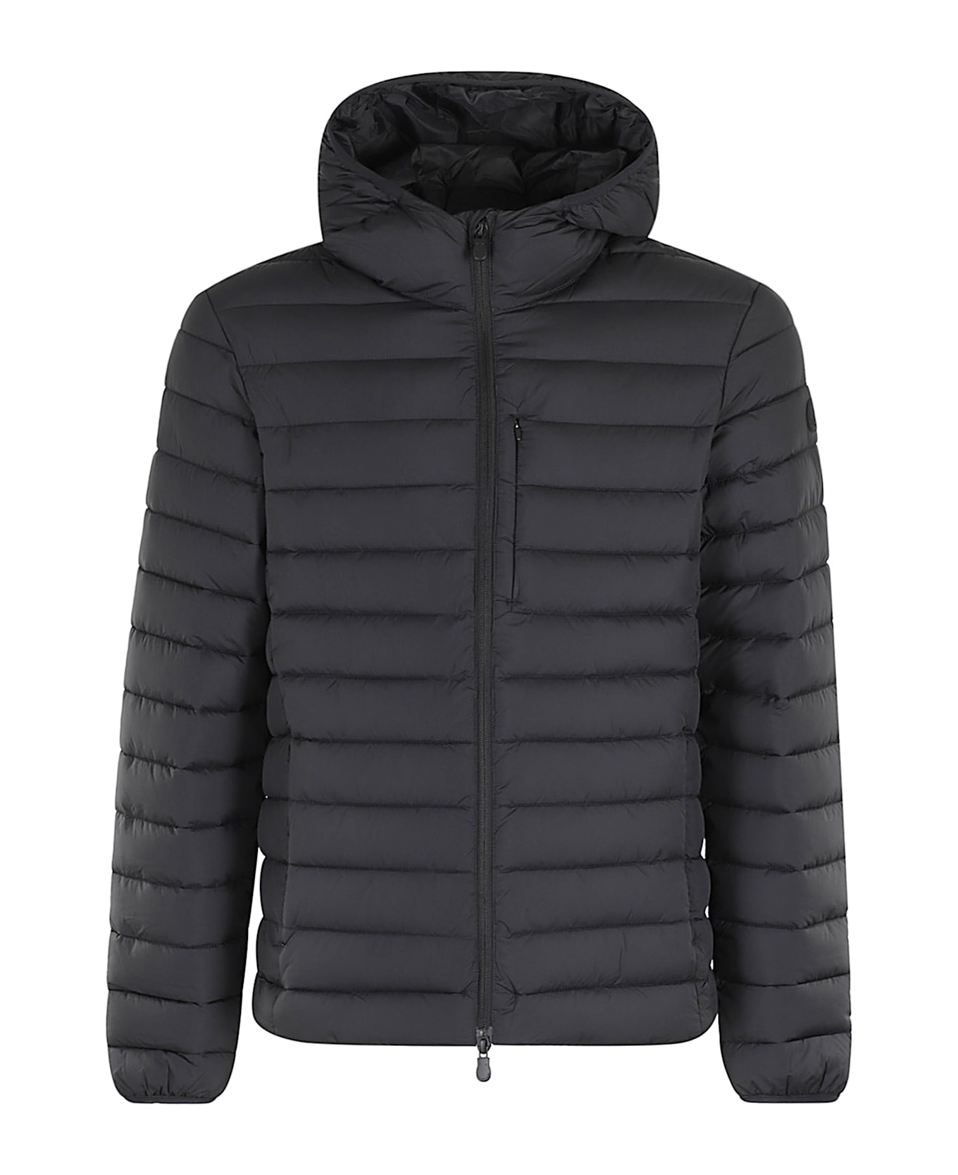 Juncus jacket - Save the Duck - Black color - Quilted waterproof fabric - Hood with elasticated hem band - Long sleeves with elasticated cuff - Tone-on-tone silicone logo applied on left sleeve - Flush chest pocket with zipper - Flush side pockets with zipper - Internal drawstring at hem - Slim fit