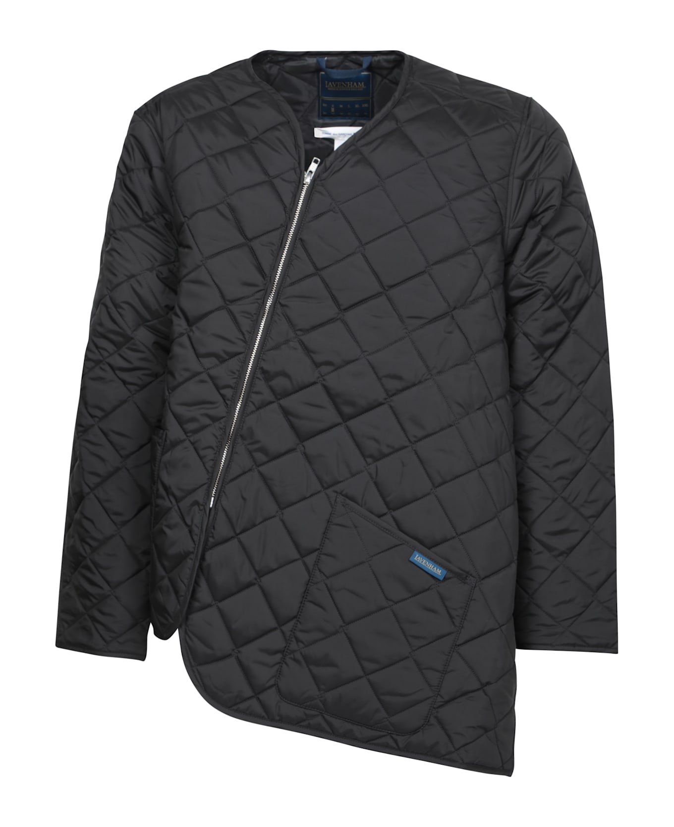 This black jacket by Comme des Garçons Shirt in collaboration with Lavenham features a distinctive quilted padding design, perfect for a modern and sophisticated look.