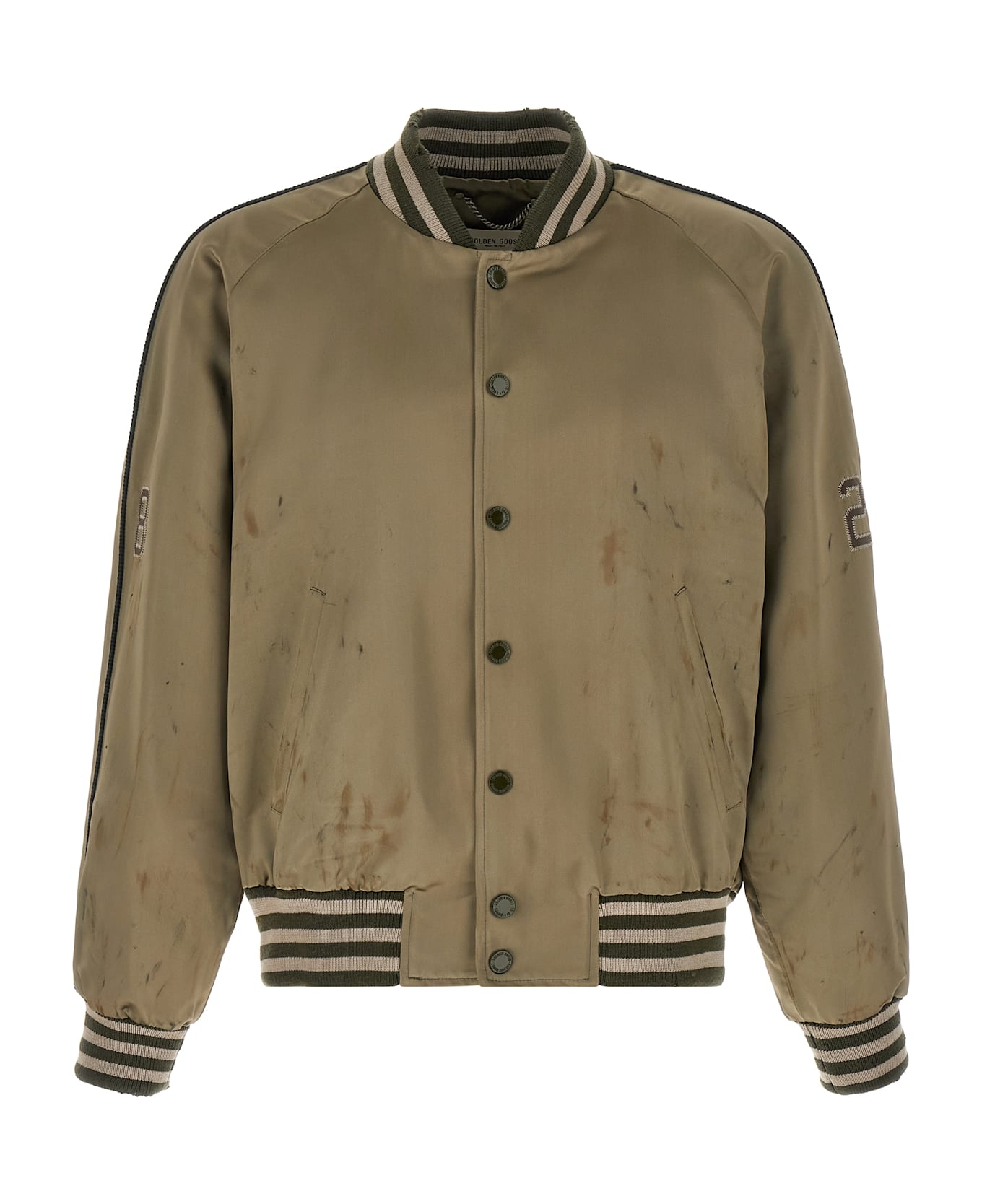 Journey' lived-in effect satin bomber jacket with striped pattern stretch wool knit details, patch on sleeves and back, front snap button closure, pockets, long raglan sleeves with cuffs, headband, lining.