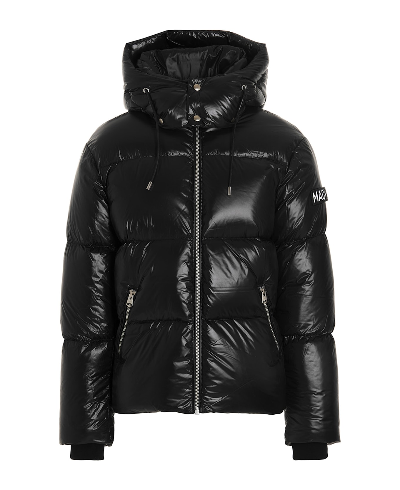 Pu down jacket filled with duck down, with a removable side logo patch, featuring a removable hood, pockets, long sleeves with knit cuffs, and a drawstring at the bottom.