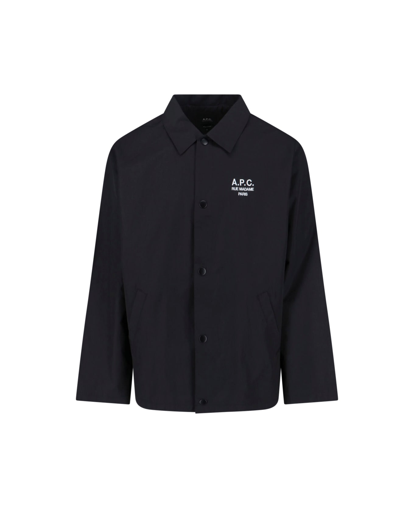 A. P. C. "regis" jacket in black fabric with classic collar, front button closure, long sleeves, contrasting printed logo on the front, button cuffs, straight hem.