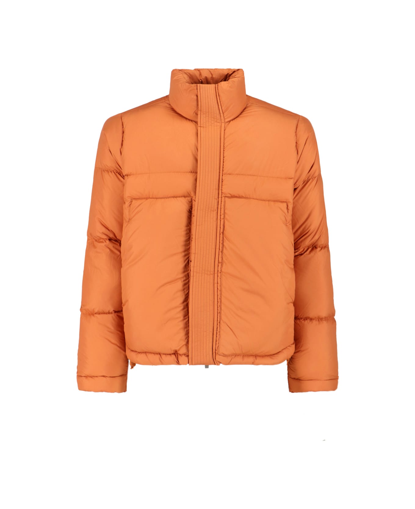 K-Way "Ripstop" orange fabric down jacket with quilted and padded design, high neck, button closure and double hidden zip, multicolor details, two side button pockets, elasticated cuffs, drawstring on the hem, straight hem.