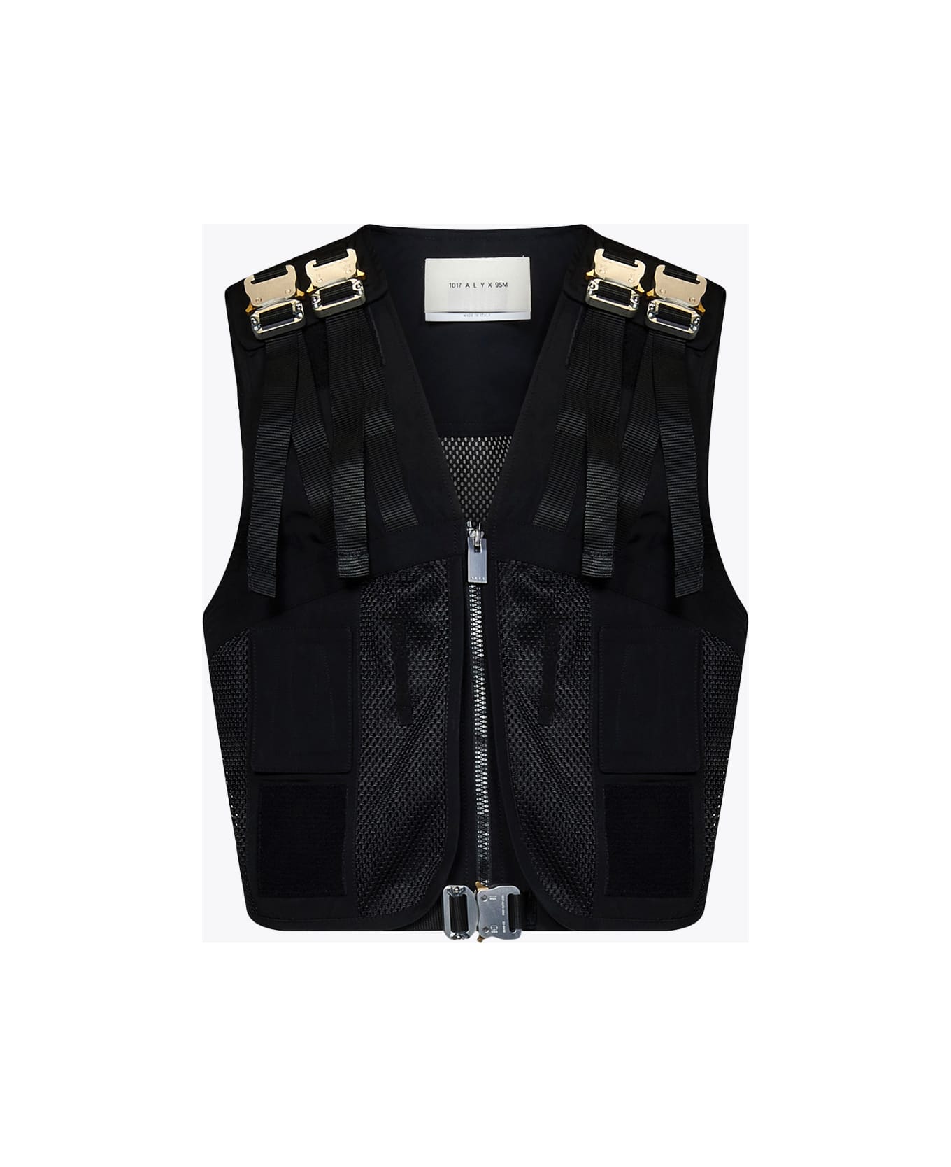 Black nylon and mesh vest with metal zip closure. Metal rollercoaster buckles detail. Velcro patches front detail. Regular fit. The model is 190 cm and wears size UNI. Composition: 100% polyester. Made in Italy.