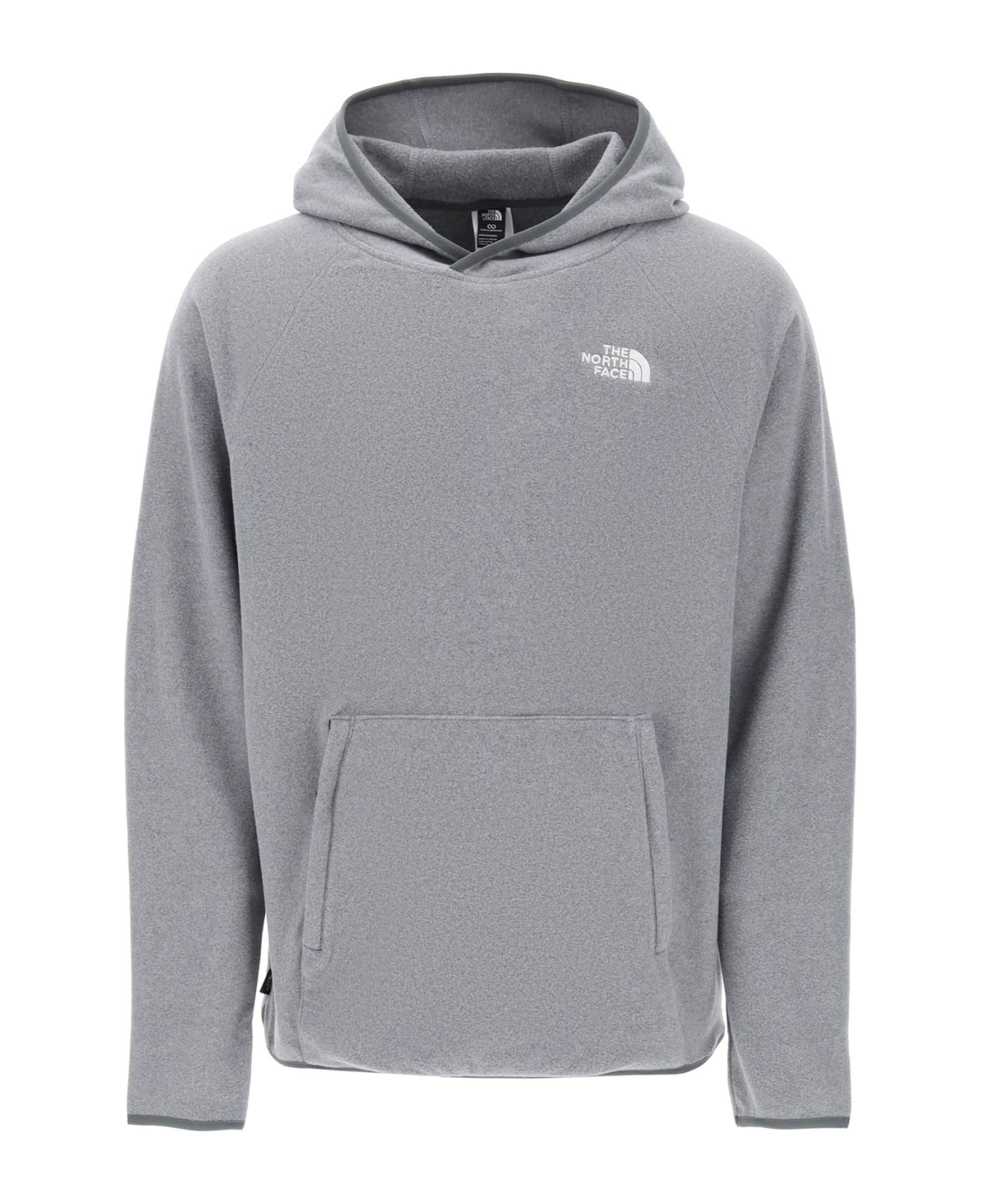 The North Face 100 Glacier Hoodie is made from soft, sustainable technical fleece and features a contrasting TNF logo embroidered on the chest and back. It has raglan sleeves, a front kangaroo pocket with zip closure, and elasticized cuffs and hem with tonal fabric trim. The fit is relaxed. The model is 187 cm tall and wears a size L.