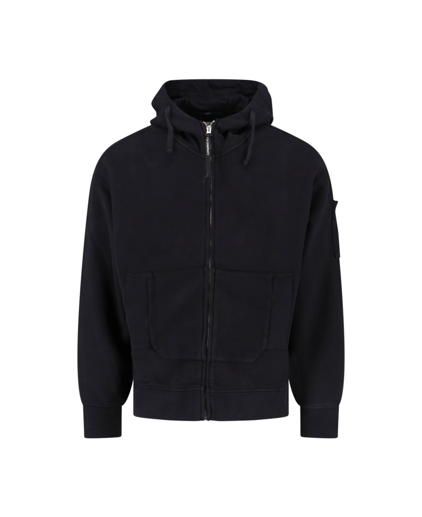 C. P. Company logo hoodie in black cotton with drawstring hood, hooded glasses detail, zip closure, flap pocket on the sleeve, logo hardware detail on the sleeve, two front pockets, elastic cuffs, straight hem.
