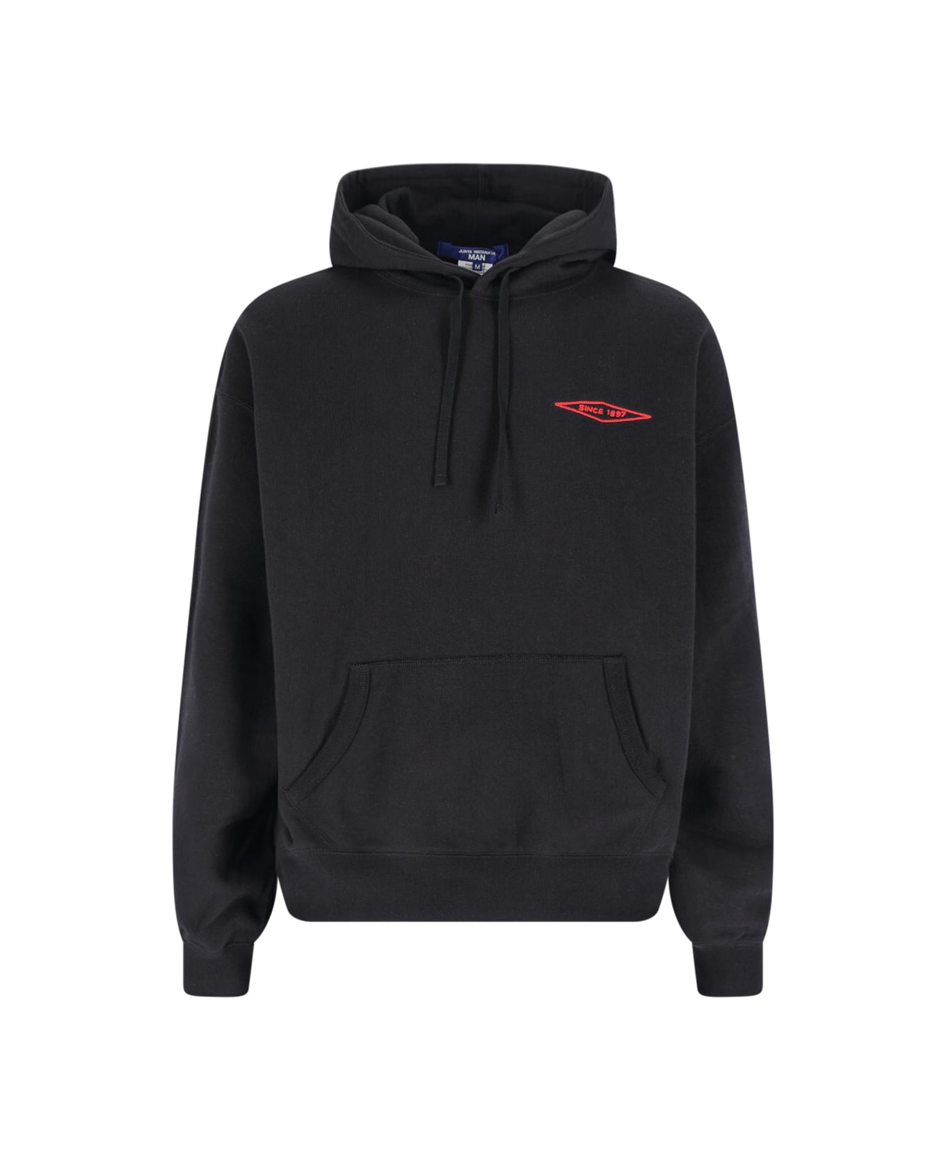 Junya Watanabe X Filson hoodie in black cotton with drawstring, red logo embroidery on the front, maxi front pocket, maxi red embroidery on the back, ribbed trims, straight hem.