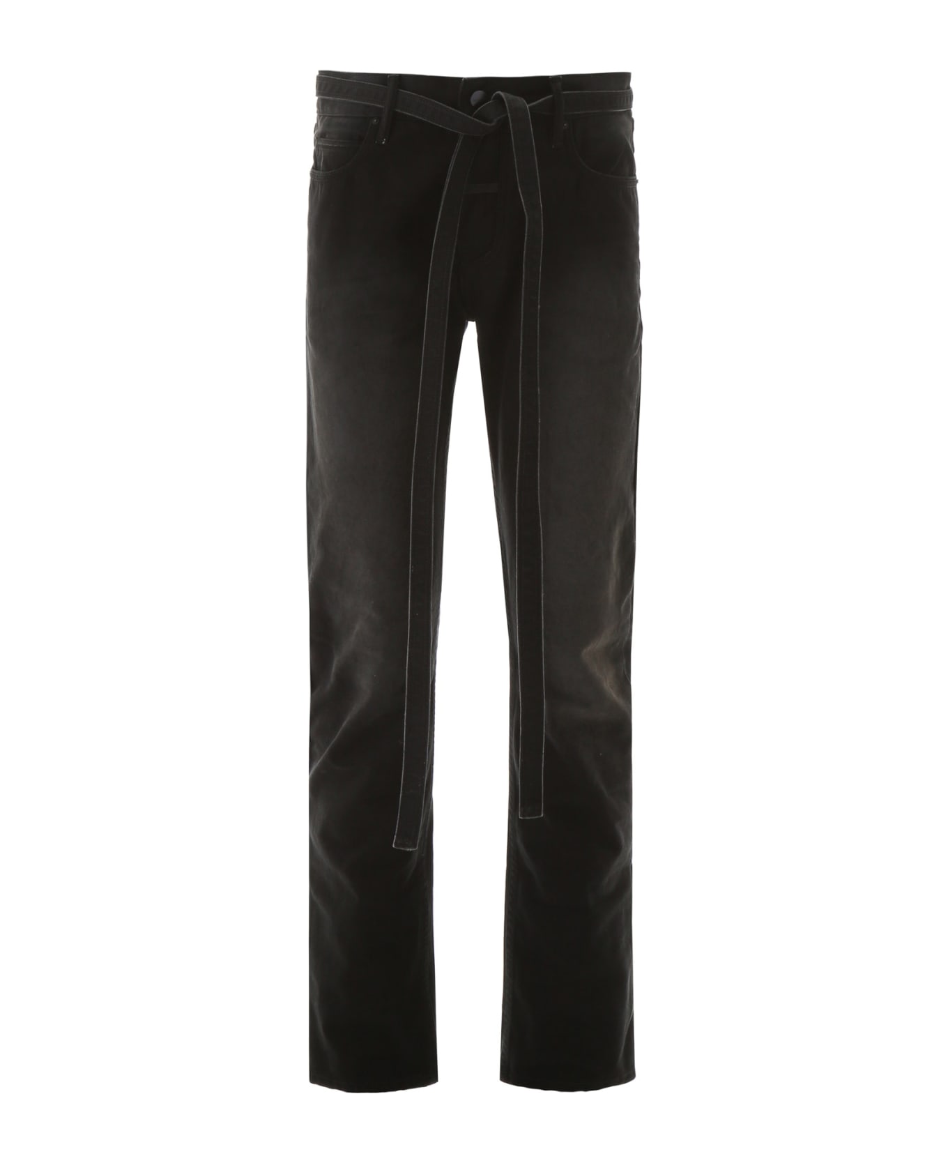 Fear Of God 6th Collection five pocket jeans in Japanese cotton denim vintage wash, slim fit, featuring button fly closure and a long tie belt with silicone logo patch on the back. The model is 183 cm tall and wears a size 30.