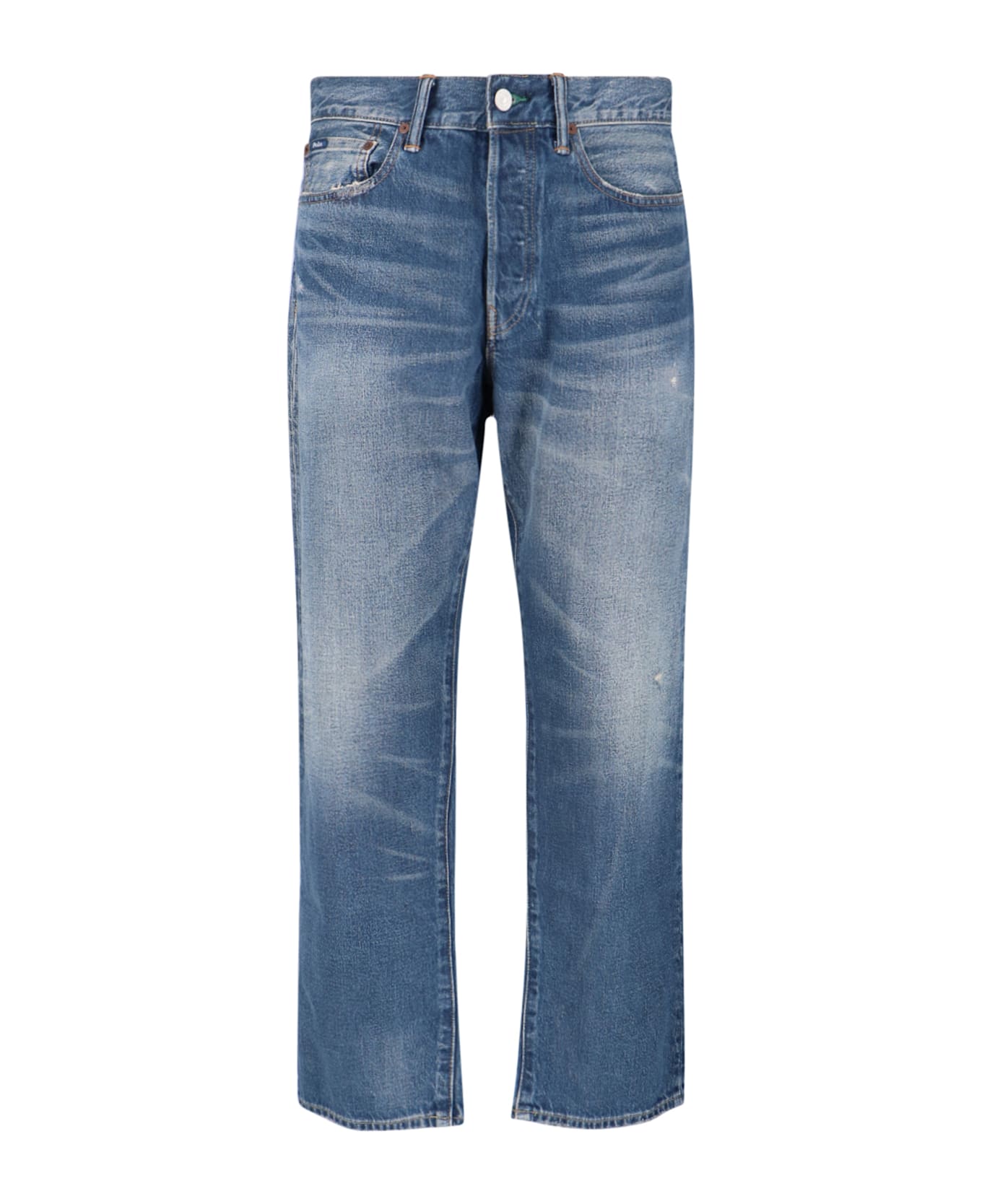 Polo Ralph Lauren straight jeans in blue denim with usured wash, mid waist, belt loops, button closure, five pocket design, logo embroidery detail on the front, logo patch on the back, straight leg.