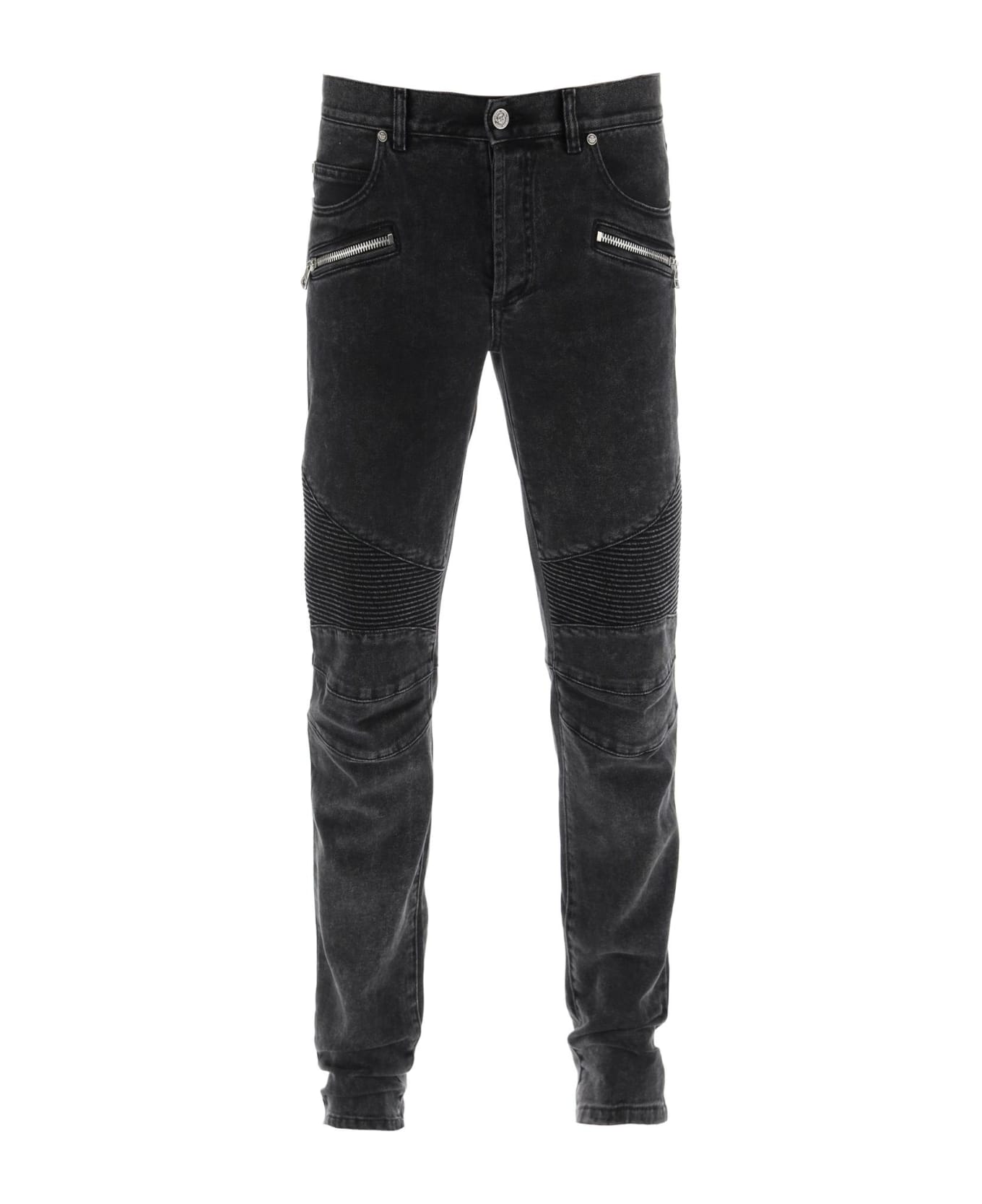 Balmain biker-style jeans made of washed stretch denim with topstitched front inserts and shaped knees. Slim fit with low-rise tapered cut. Five-pocket design with two additional front zip pockets, button fly and fabric logo patch on the back. The model is 187 cm tall and wears a size 30.