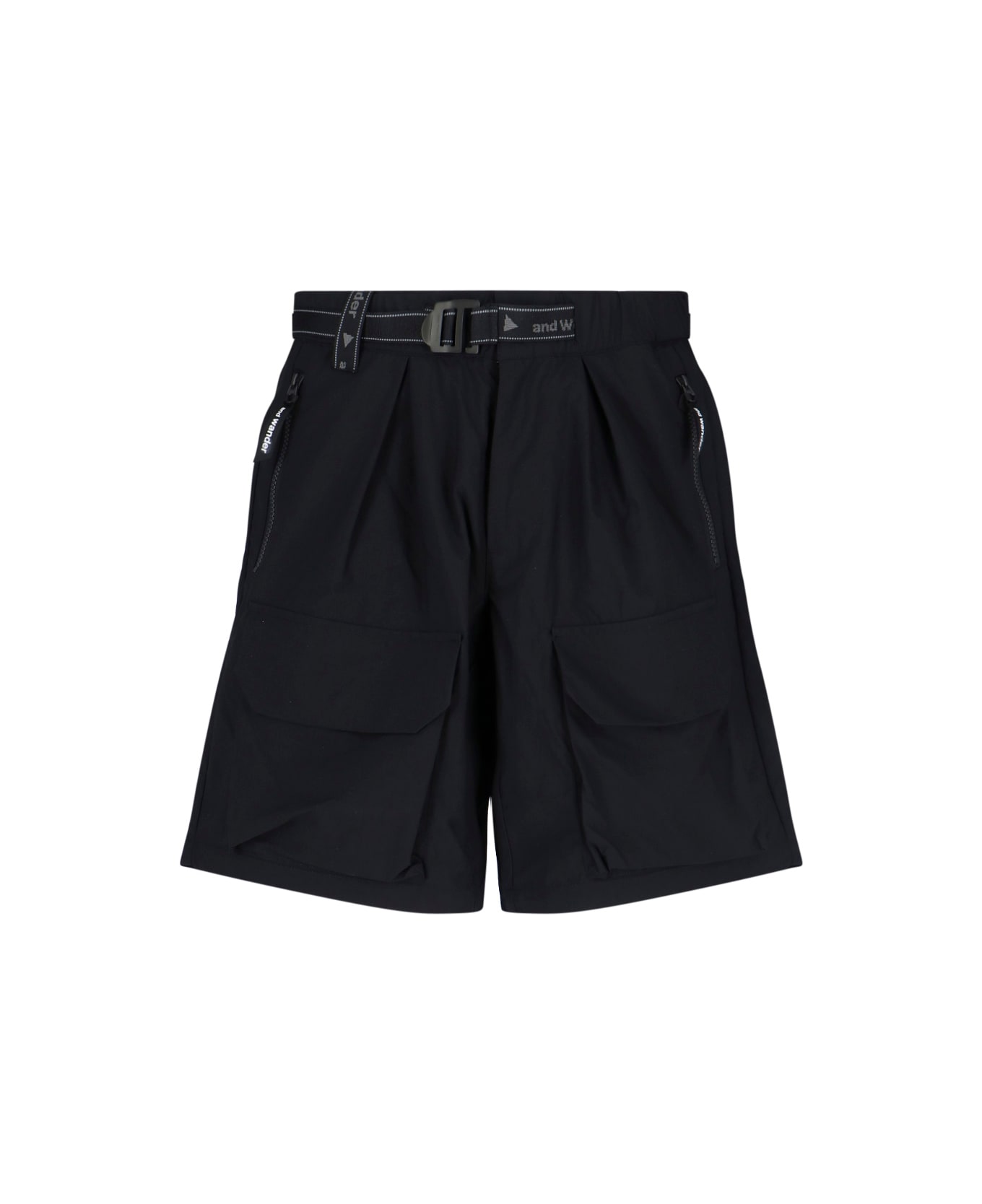And Wander belted cargo shorts in black nylon with elastic mid waistband, adjustable belt at the waist, logo pattern, button and zip closure, front pin tucks, two front cargo patch pockets, two side zip pockets, two back cargo pockets, straight leg.