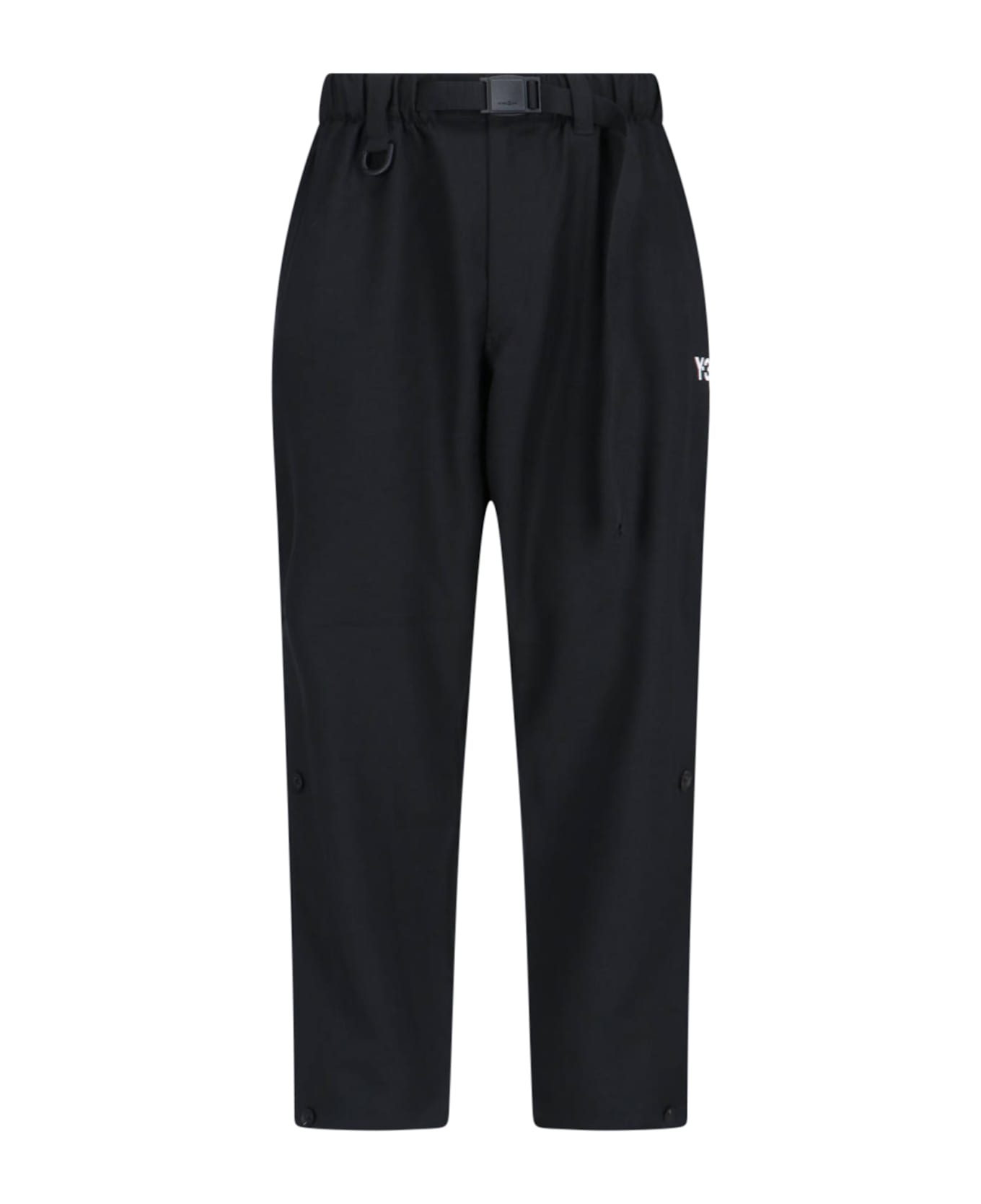 Y-3 straight pants in black fabric with mid waist, removable belt at the waist, button and zip closure, two side pockets, contrasting logo print on the side, iconic contrasting bands on the side, adjustable button detail, two back button flap pockets, and straight leg.