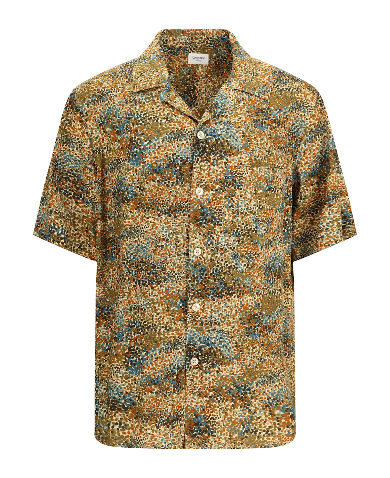 The boxy shirt with button fastening and short sleeves by saint laurent features a relaxed contemporary silhouette enhanced by an all-over print. the pointed collar refines the profile with understated elegance, while the chest pocket adds a subtle functional detail. the fluid construction highlights the boxy fit with balance, making this shirt by saint laurent a distinctive piece with confident character. Composition: 100% % Viscose