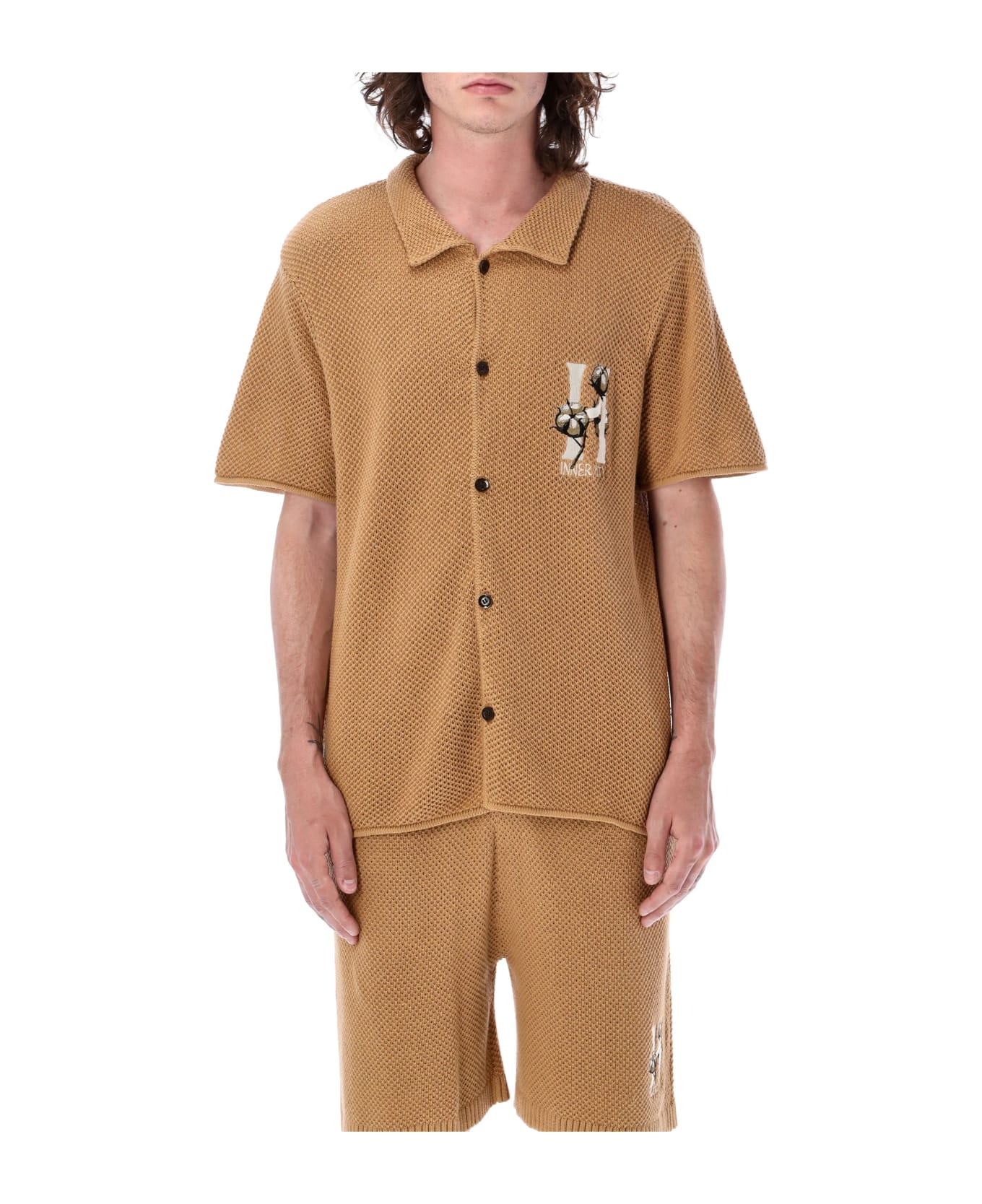 Cotton Knit H Button Up By Honor The Gift. Featuring: Spread Collar Front Button Fastening Short Sleeves Art Embroidery At Left Chest Straight Hem Model Is 1,90 M Tall And He Is Wearing Size L