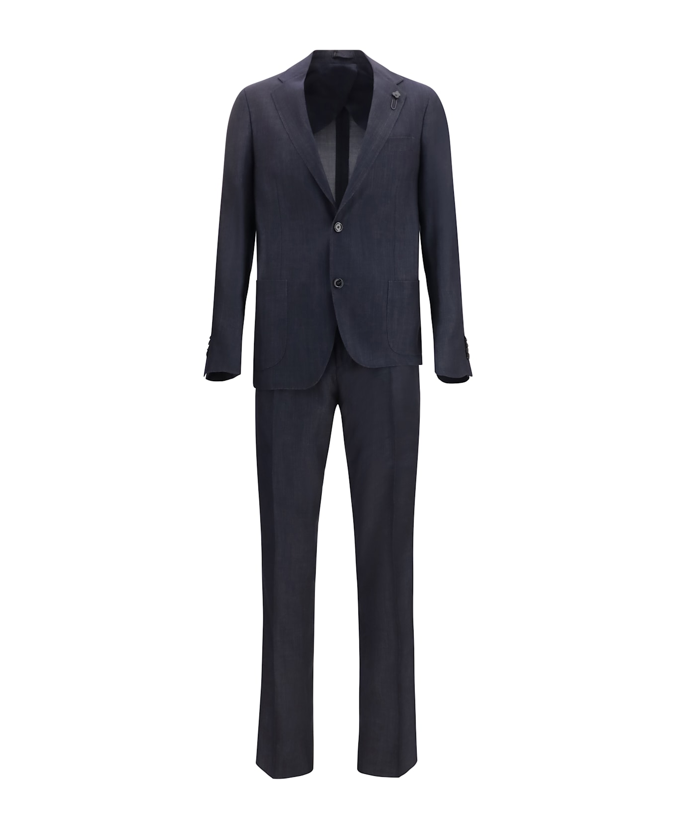 The iconic cotton suit by lardini is an example of timeless elegance. the single-breasted jacket features a peak lapel with the iconic pin, while the two side patch pockets add functionality and style. the refined-cut trousers feature a hook and zip closure, belt loops at the waist, and two slash pockets for a flawless and practical look. a perfect suit for those seeking a balance between classic tailoring and modernity.