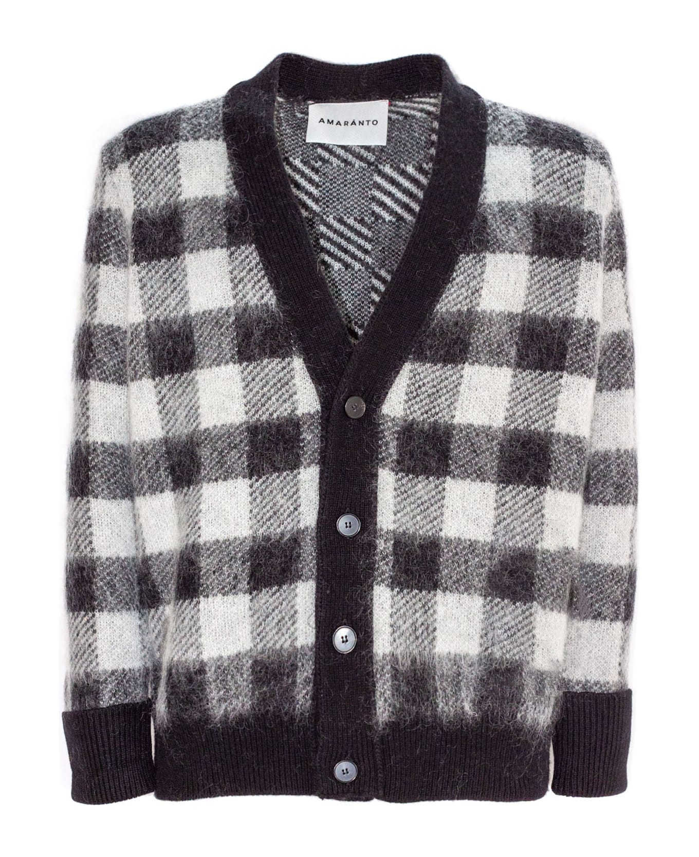 Black and white wool and cashmere blend cardigan with check print, V-neck, long sleeves, ribbed trim, front button fastening Composition: 90% Wool, 10% Cashmere