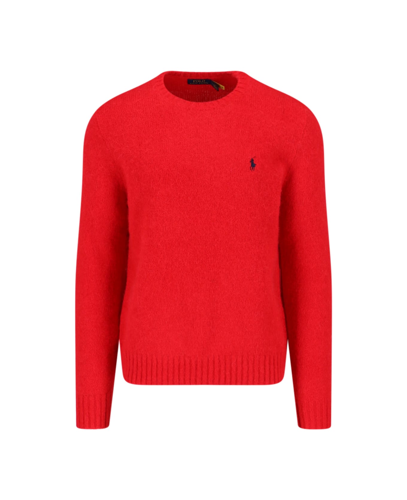 Polo Ralph Lauren logo crewneck sweater in red wool blend with knitted, blue logo embroidery on the chest, ribbed trim, straight hem.