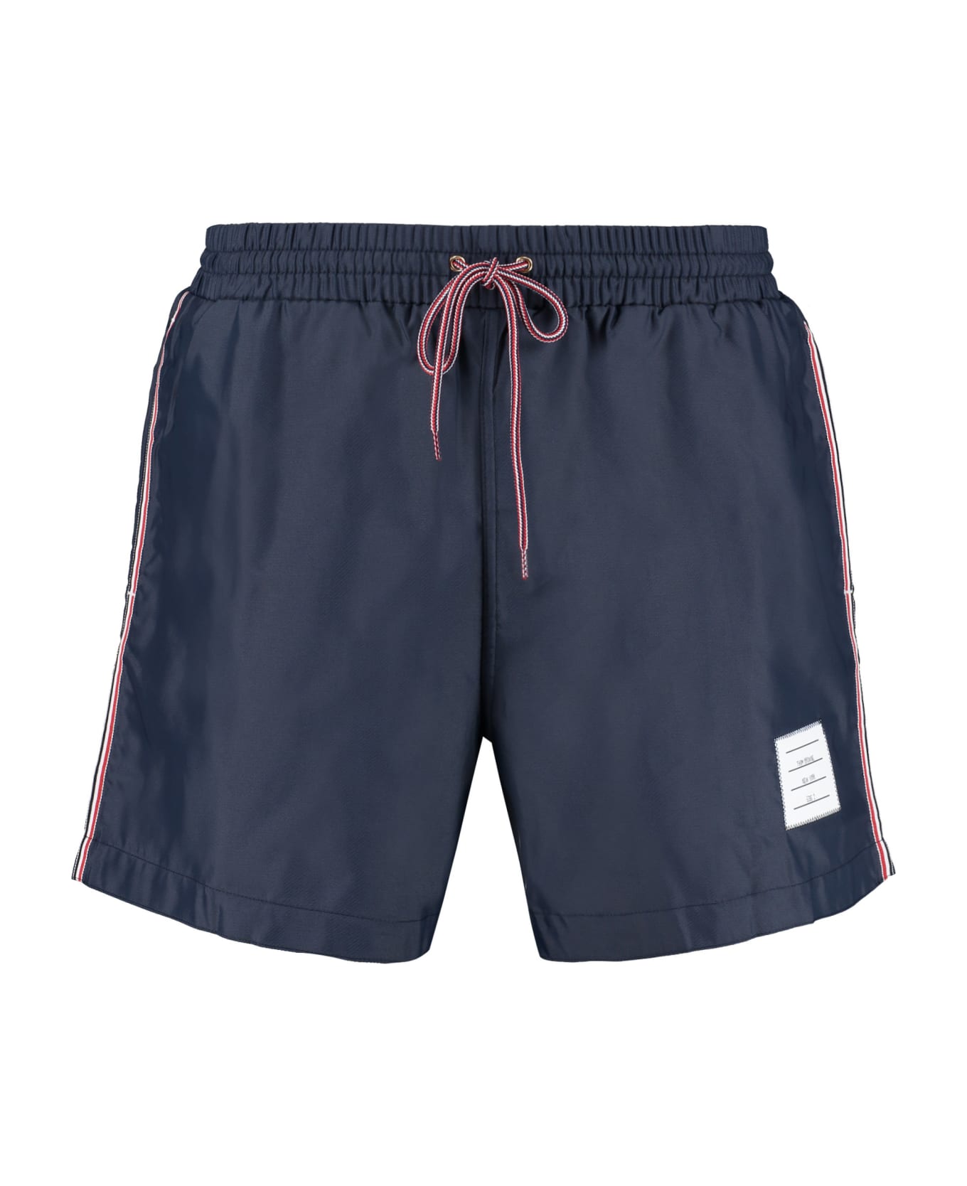Contrasting logo patch two open side pockets back pocket contrasting color band at sides thom browne's size conversion: 00 = 42it 0 = 44it 1 = 46it 2 = 48it 3 = 50it 4 = 52it 5 = 54it 6% polyurethane, 94% polyamide Composition: 6% % Polyurethane, 94% % Polyamide