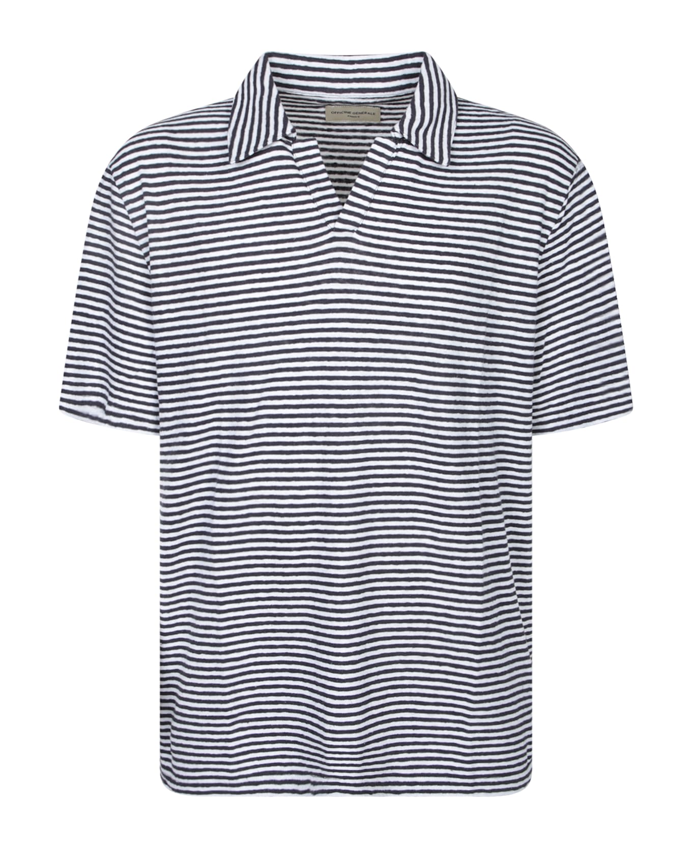 This stylish Officine Generale polo features a horizontal blue and white striped design, short sleeves, and a pointed collar for a contemporary look.