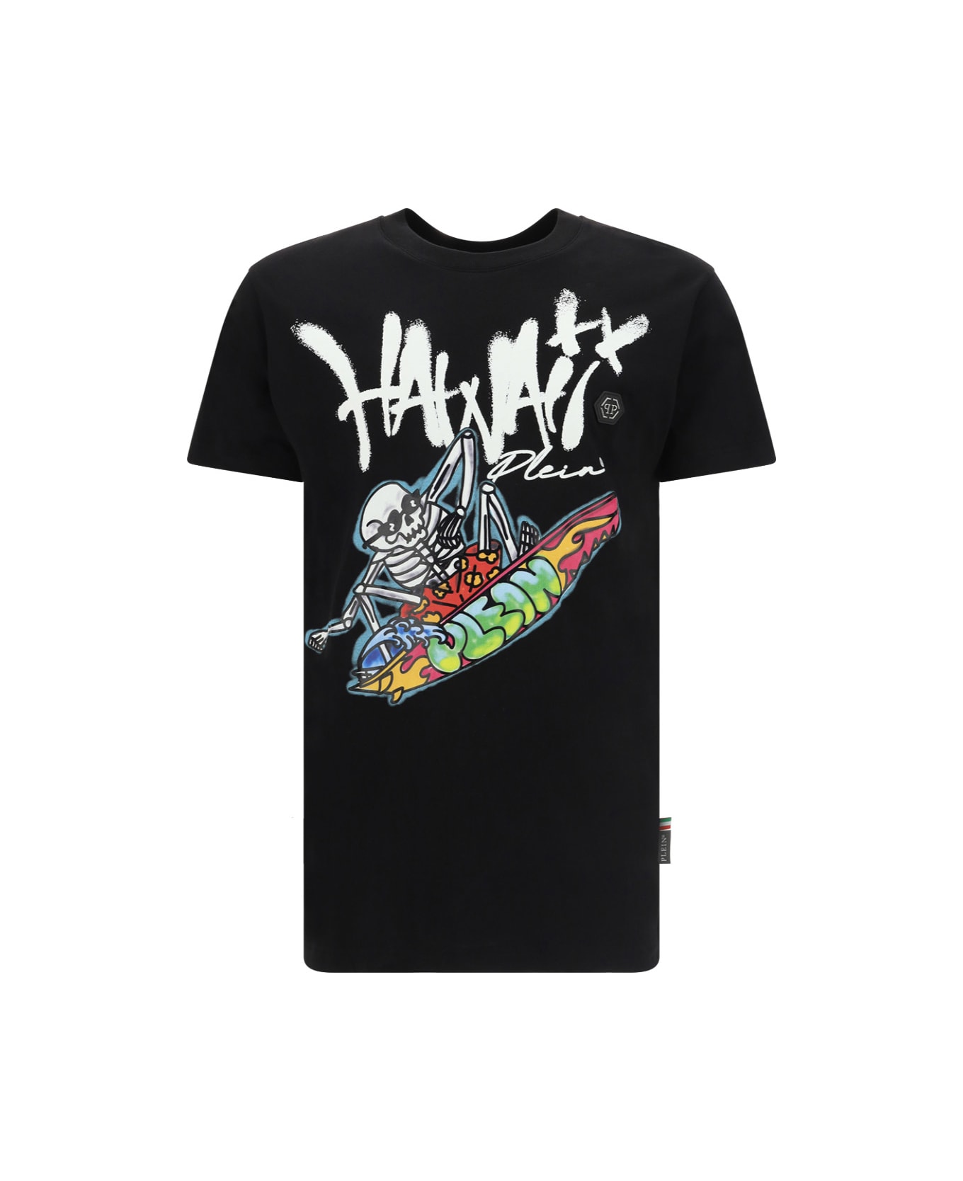 Cotton hawaii t-shirt by philipp plein, classic crew neck, multicoloured printed graphic on the front, contrasting brand monogram on the back, embossed patch on the front with iconic brand logo, oversize fit.