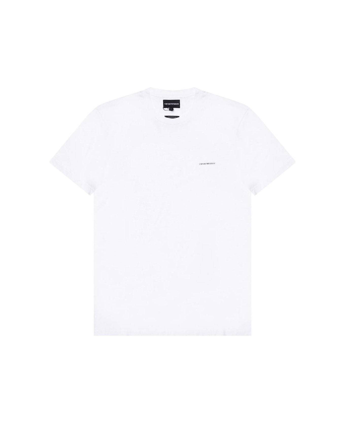White crewneck T-shirt from Emporio Armani. Made of cotton, this item showcases a black graphic print with the brand's logo on the front. Composition: 70% Lyocell 30% Cotton