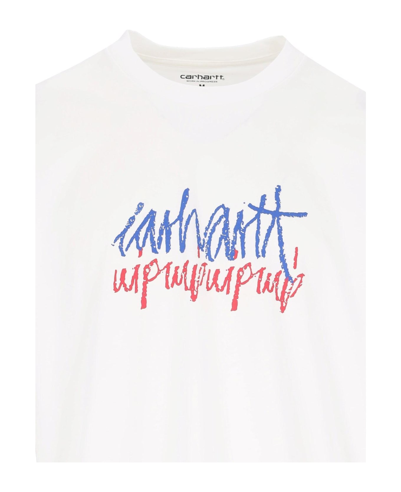 Carhartt WIP S/S Stereo T-shirt in white cotton jersey with contrasting red, blue and contrast details, crew neck, short sleeves, two-tone logo print on the front, maxi logo print on the back, ribbed trim, and straight hem. composition: 100% cotton size and fit: soft fit
