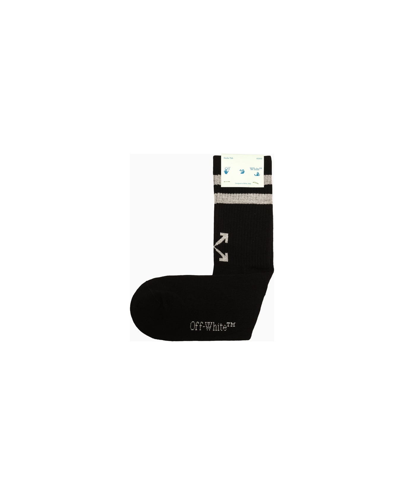 made in italy off-white c / o virgil abloh - stripped socks for men in mixed cotton. ribbed knit pattern stretchy leg. contrast off-white arrows and logo pattern at leg. contrast logo at the plantar arch. reinforced heel and toe. composition: 80% cotton 15% polyamide 5% elastane. height of leg: 18 cm. one size.